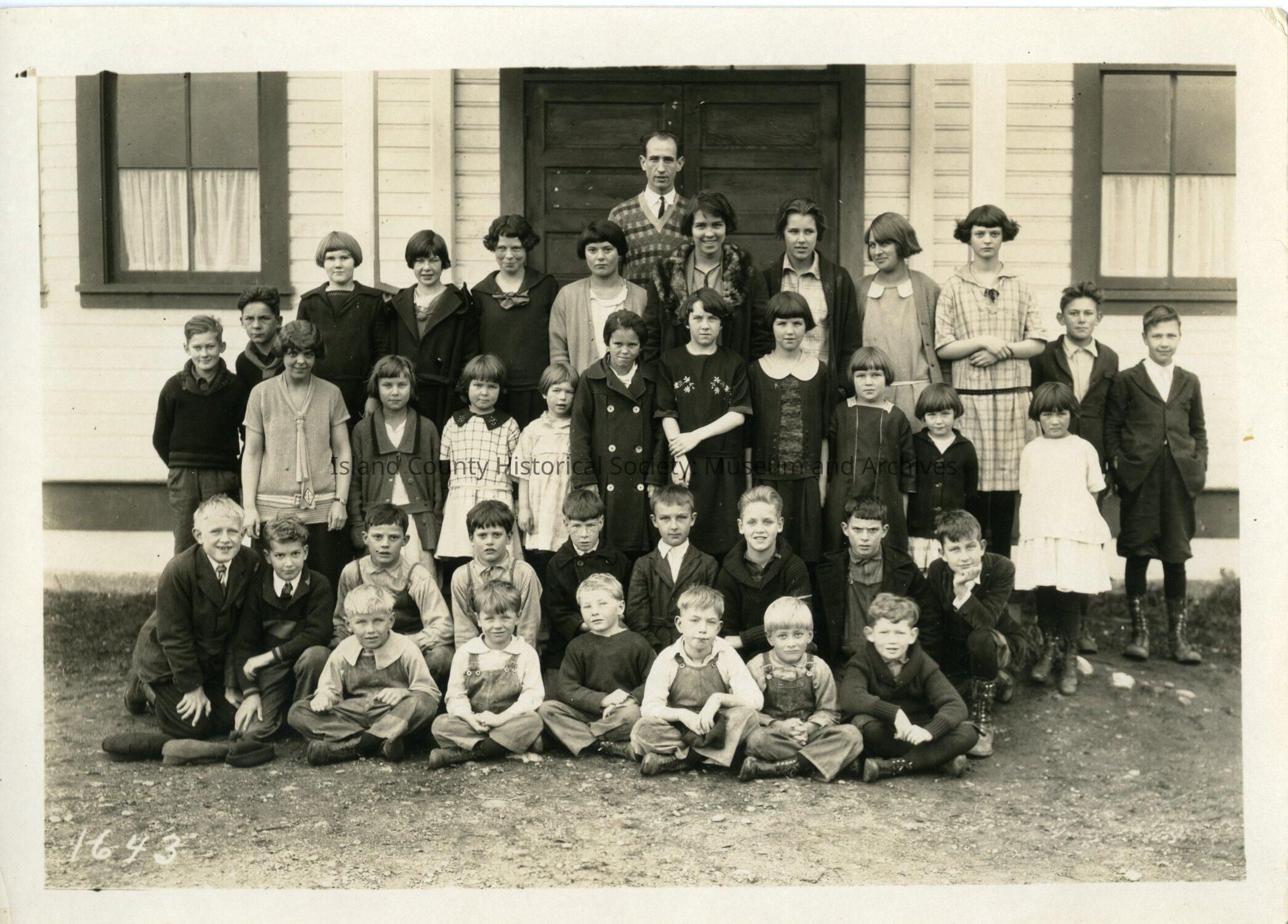 Greenbank School. 37 children, from small boys seated in front to tall girls standing in back, in front of school. Male teacher stands on porch behind children. Walter Autio is on the far left in the front row. Probably taken during the Depression. On back in purple ink details the cost of the photo alone or mounted and created by Perkins Studio, 314 Crown Bldg. Second and James St. Seattle, WA.Lexicon