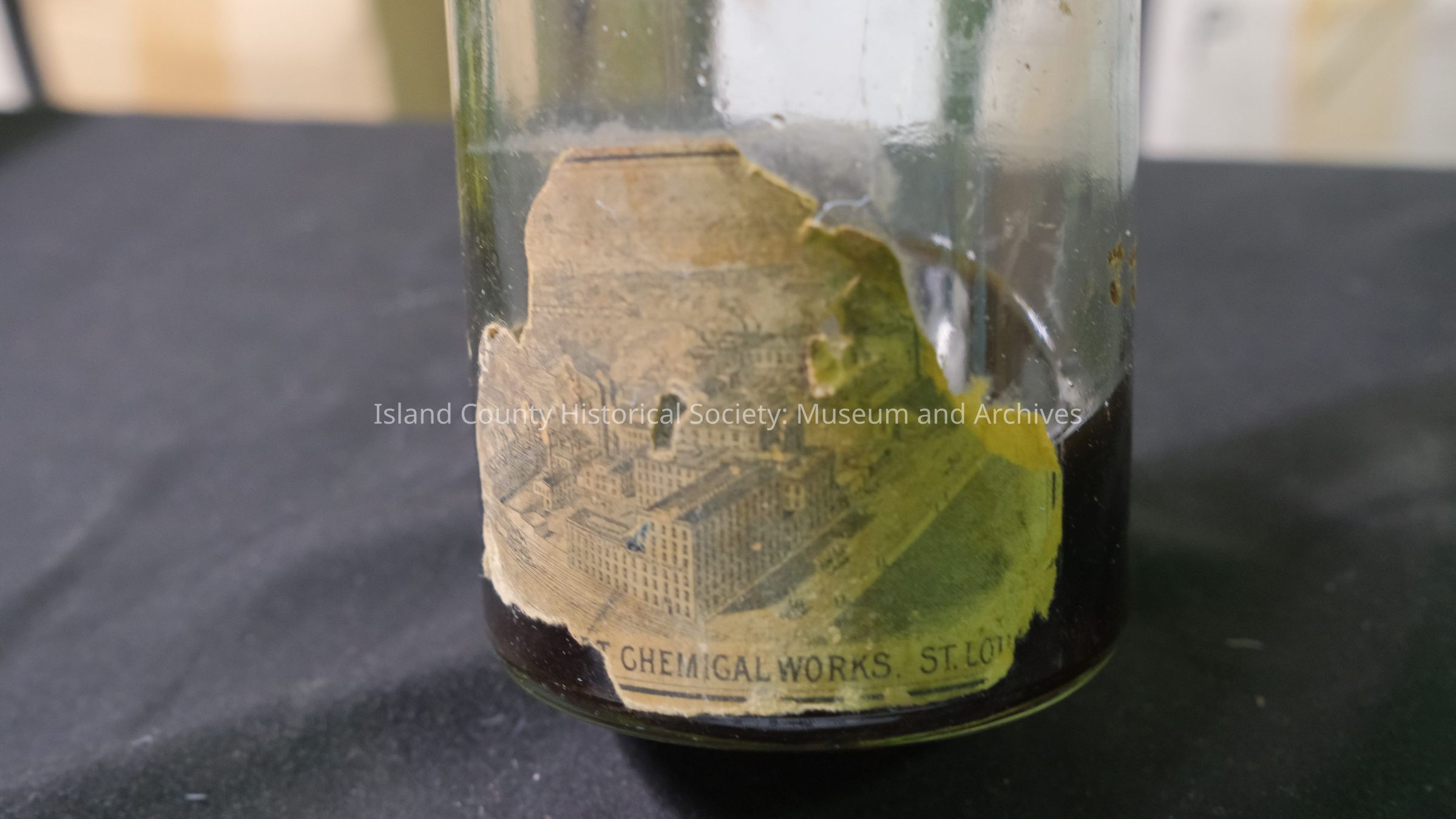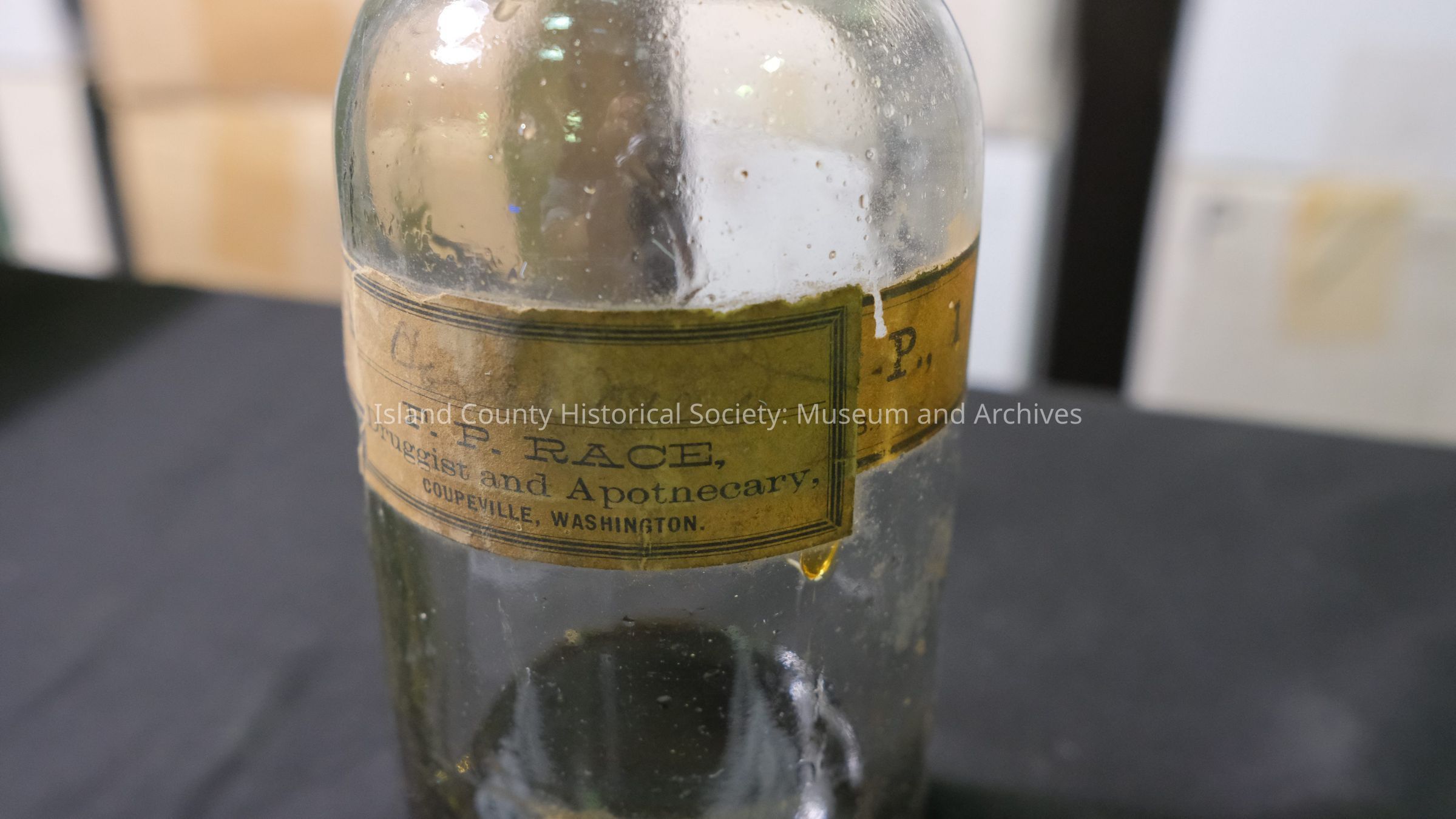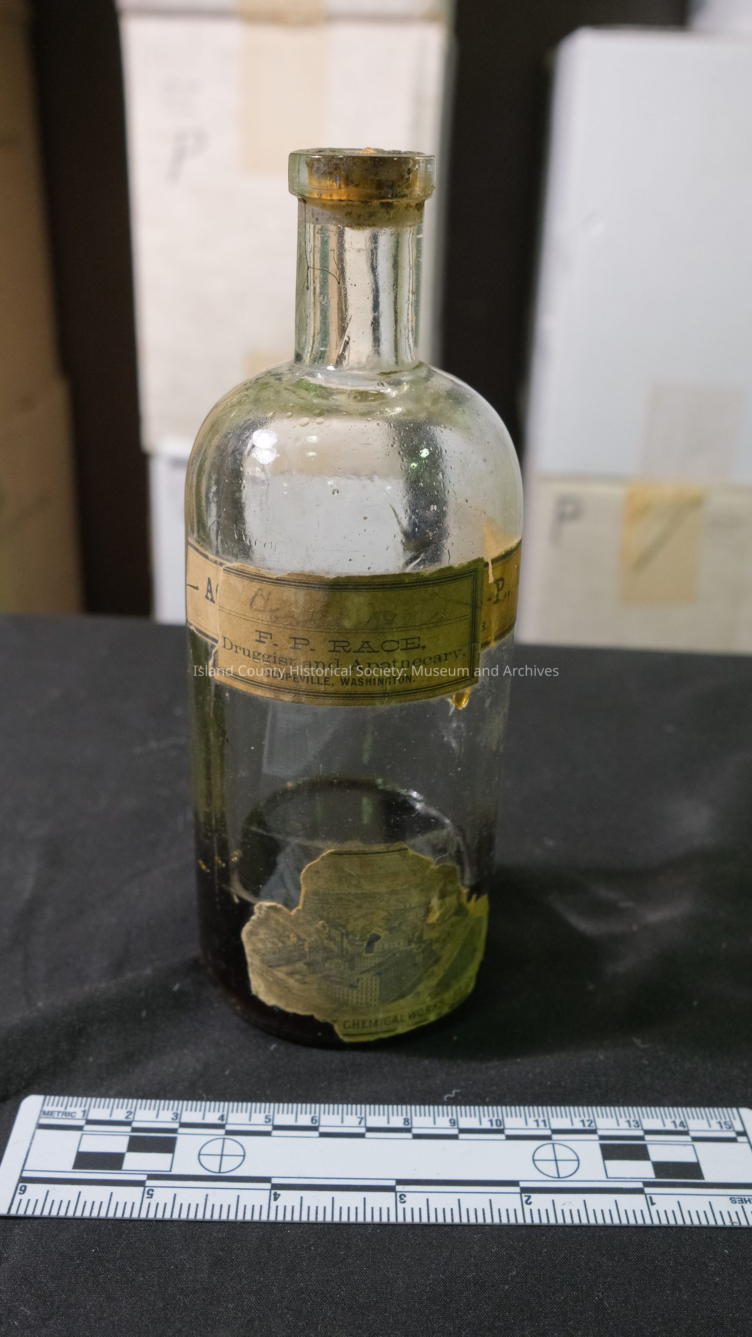 white bottle 7 1/2" with cork; 1/3 full F. P. Race Druggist & Apothecary; Chemical Works, St. Louis, MO