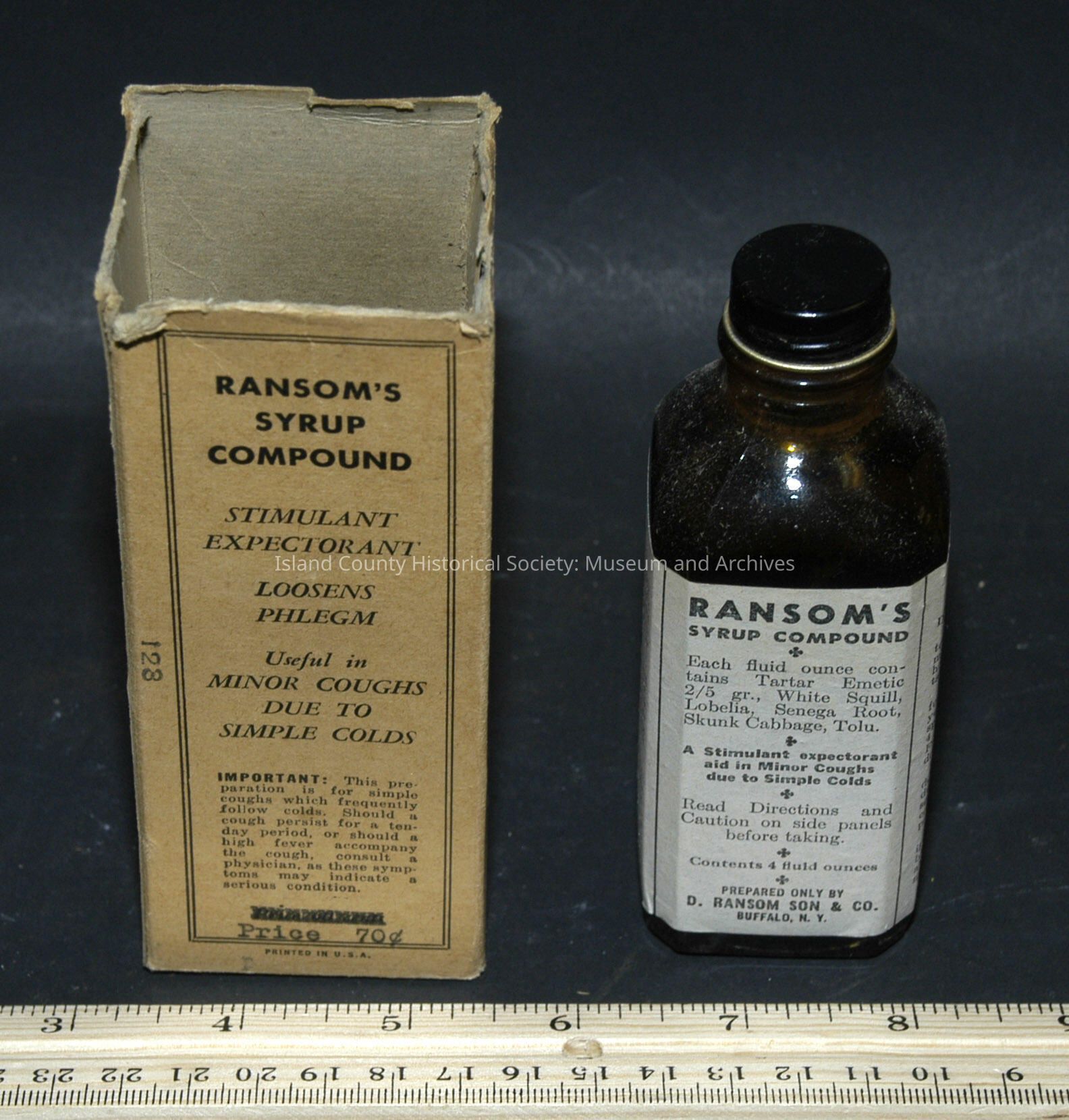 clear 4 1/2" bottle - flat sides with metal top, in carton RANSOM SYRUP COMPOUND Price 70 cents (full) Prepared only by D. Ransom & CO. Buffalo 3 New York