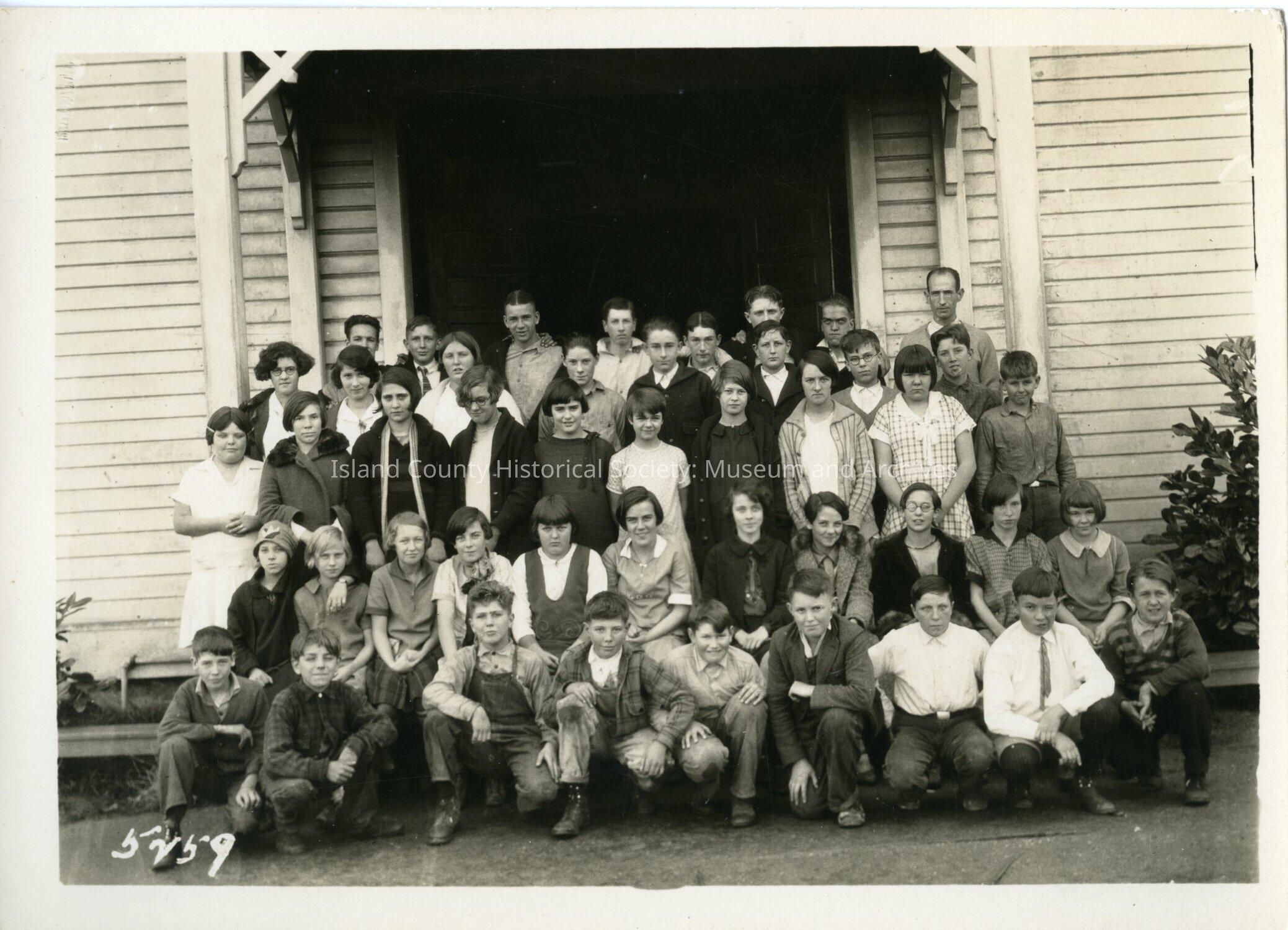 Greenbank School. 45 children, from small boys squatting in front to tall boys and girls standing in back, in front of school. Male teacher stands on porch beside children.Lexicon