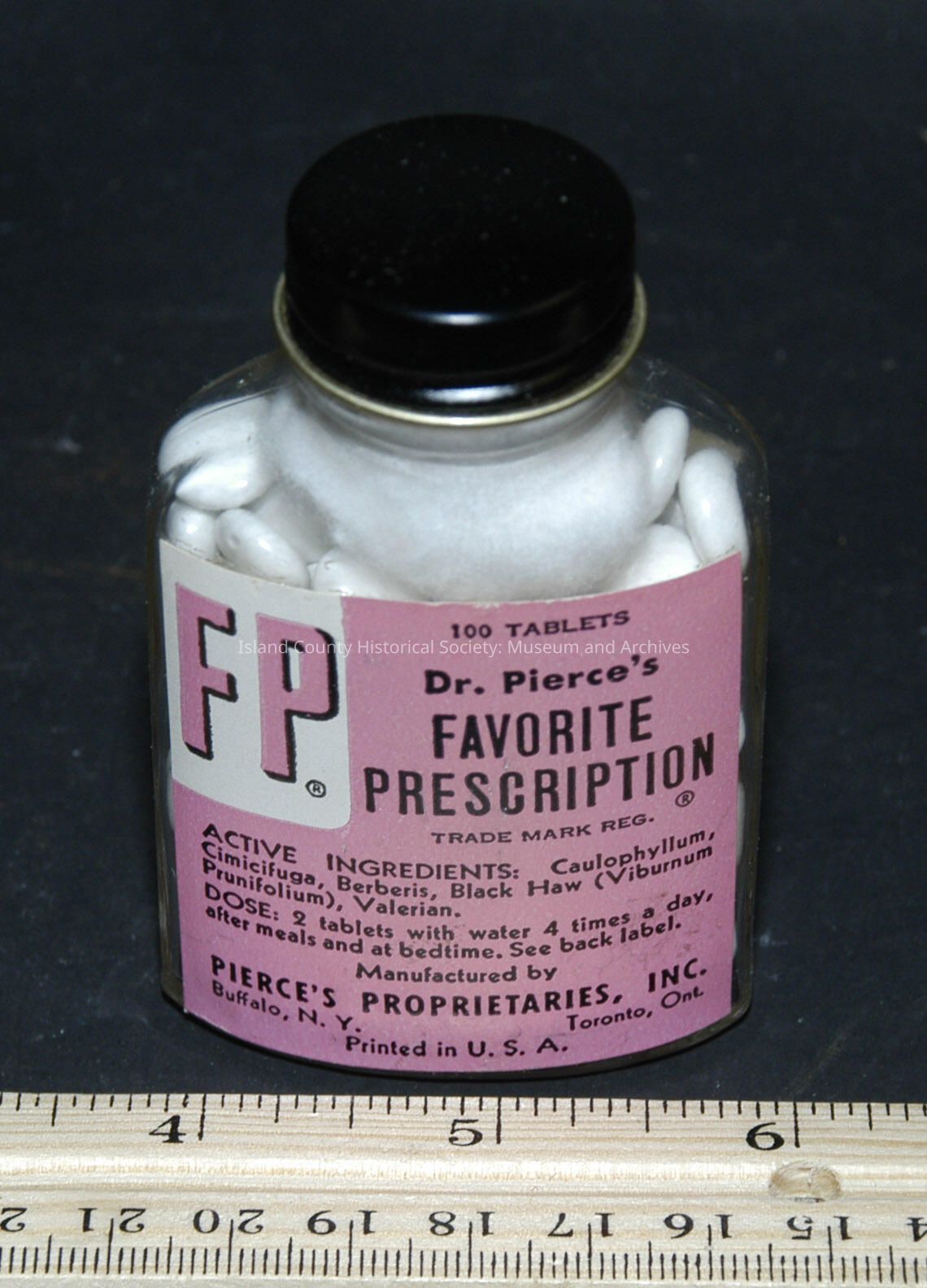 clear bottle 3 1/4" with cap, Pierce's - Dr. Pierce's Favorite Prescription, pills, full