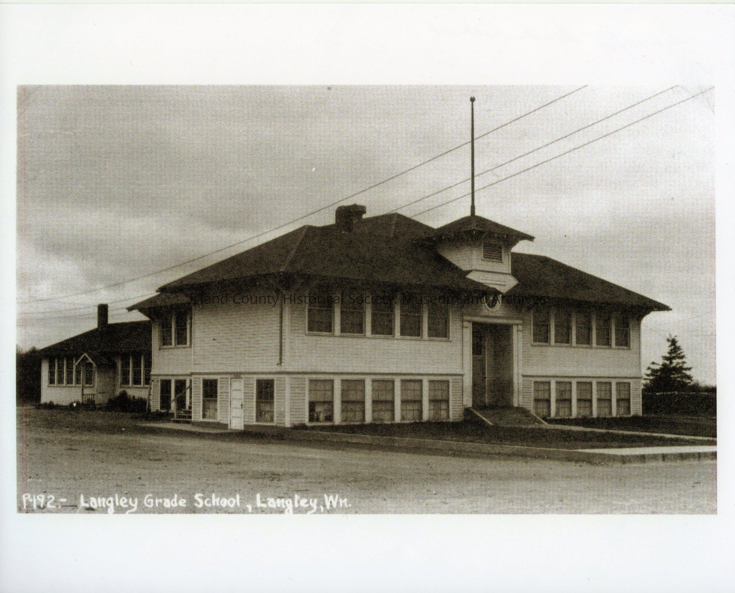 Langley Grade School, Langley, WA. One and a half story building with many classroom windows in daylight basement. Enclosed entry with bell tower and lightning rod. Smaller one-story building or addition in rear.Lexicon