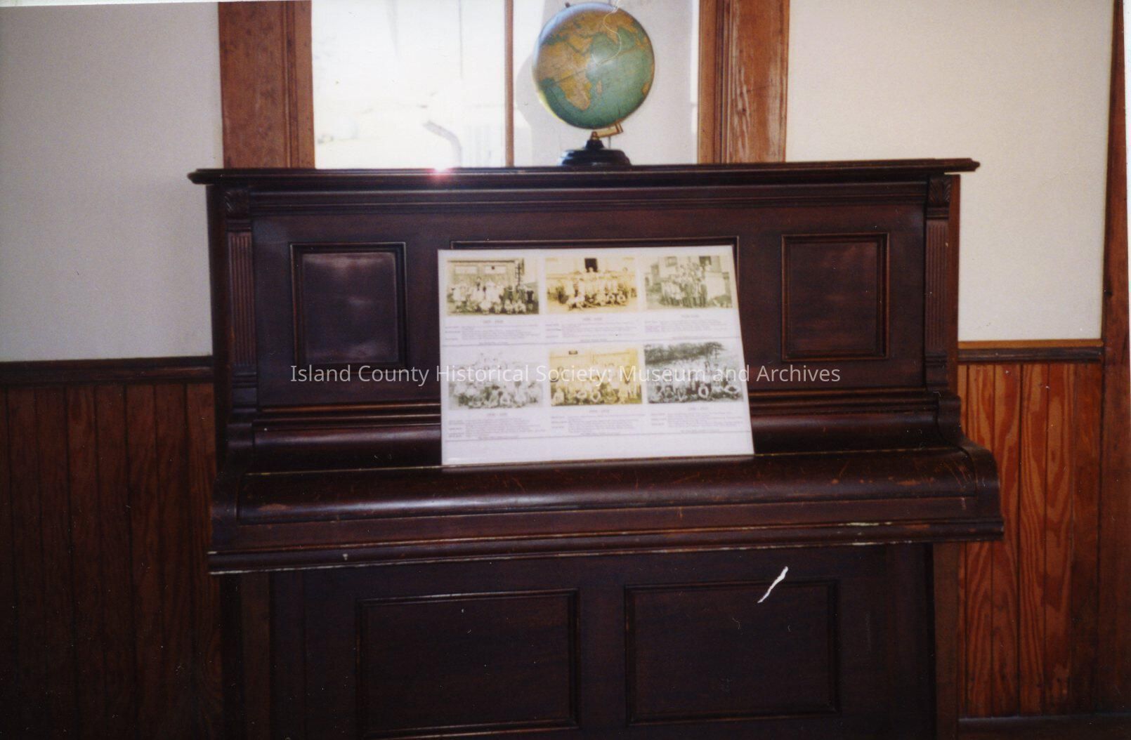 San de Fuca school interior following restoration. Piano with pictures of classes propped on it and a globe on top.
