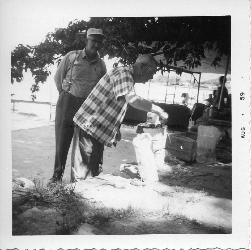 Mel Neil and Tom outside working on a project. Photo dated Aug 59.