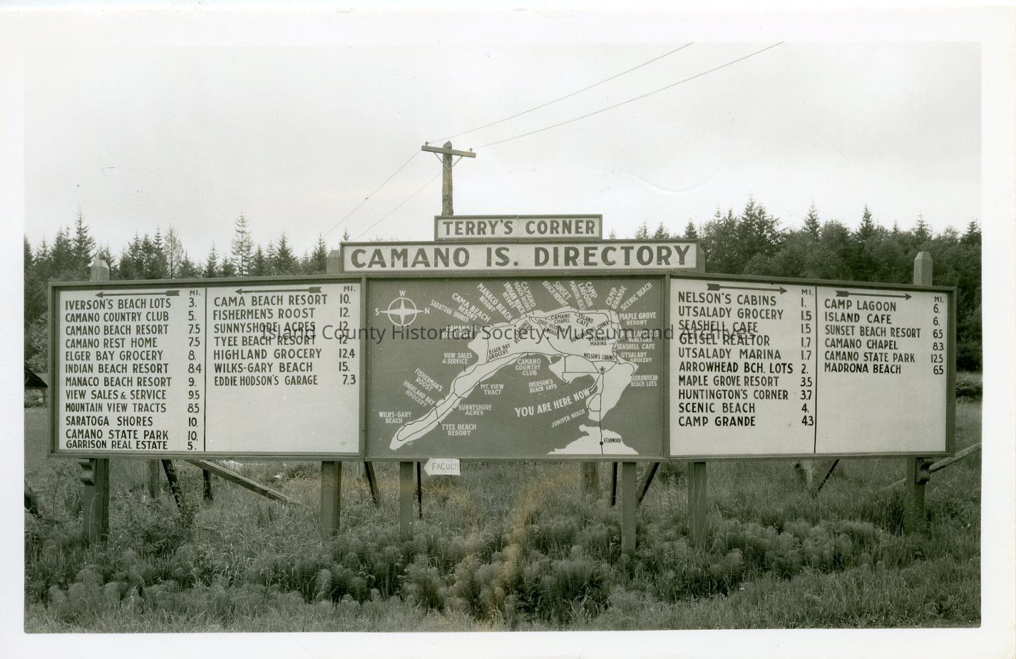 Postcard depicting a directory sign for Camano Island, with a small sign above labelling "Terry's Corner". Likely c. 1950s.