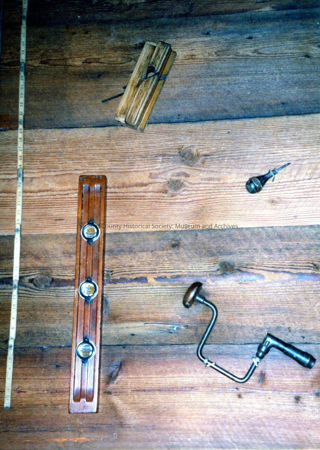 San de Fuca school interior following restoration. Antique hand tools lying on wood: Folding tape measure, level, hand drill, awl and miter box.