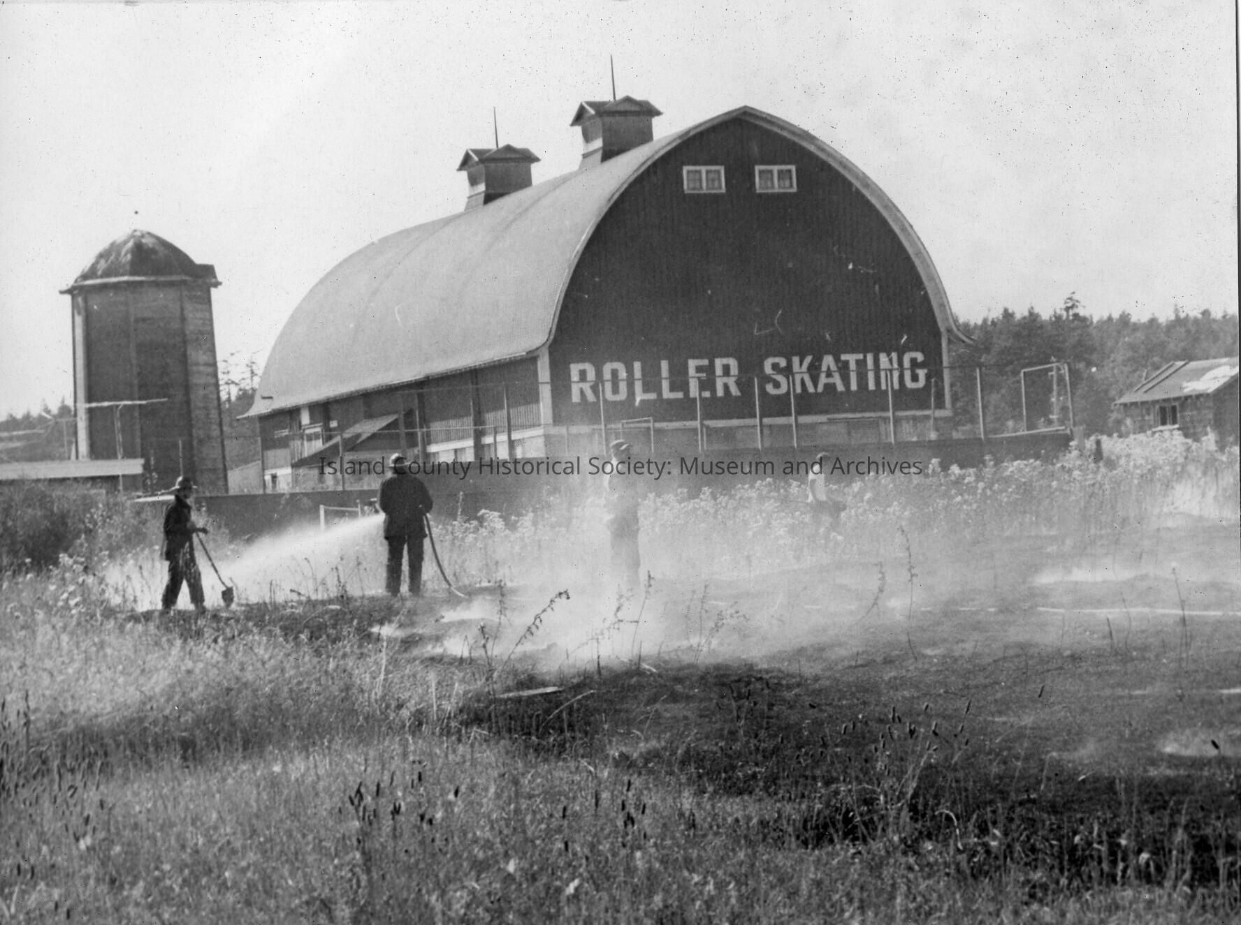 Roller skating barn on what was formally the Morse farm. A group of four men are working in front of the barn spraying water, digging, etc.