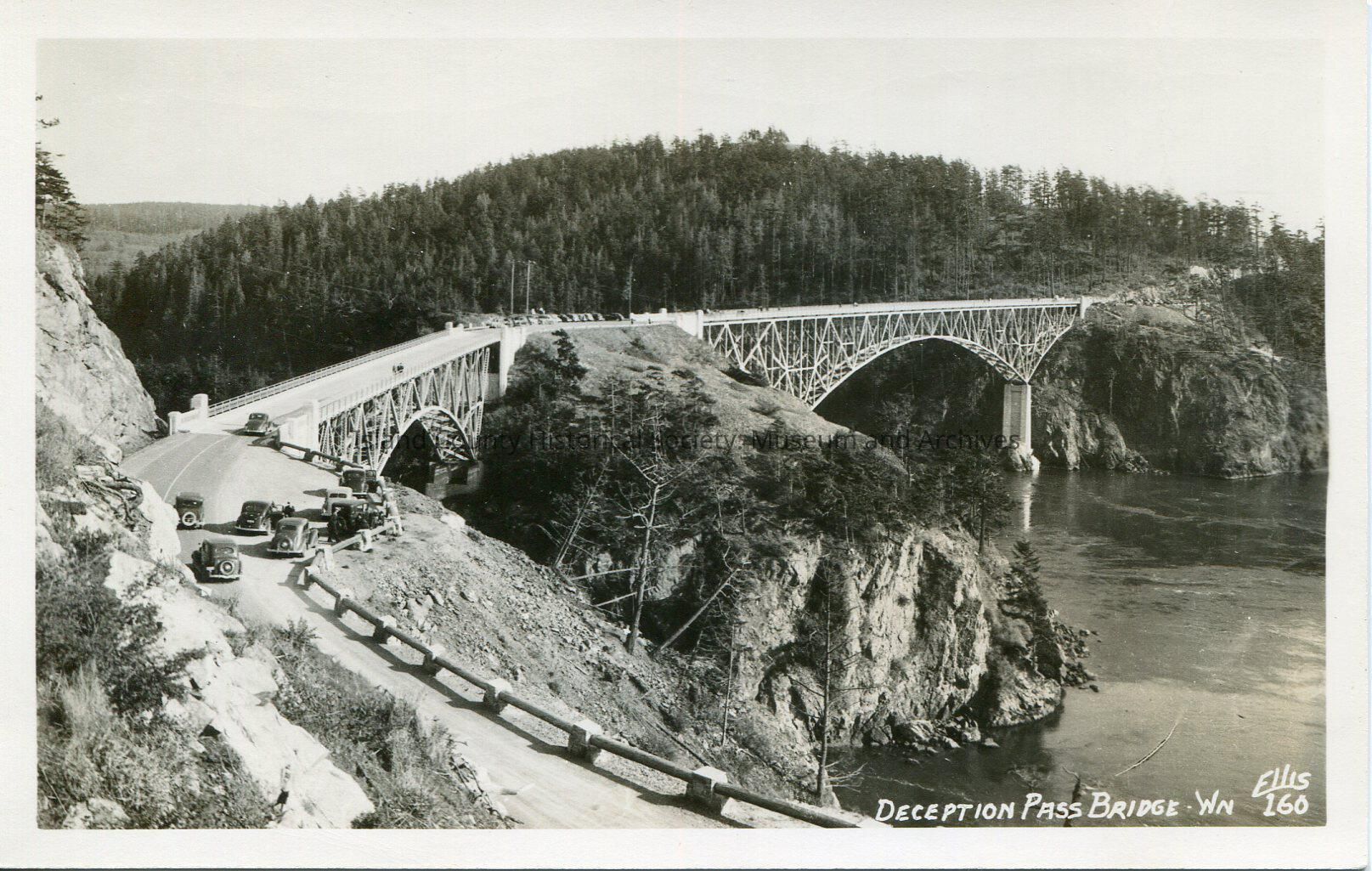 Picture postcard depicting Deception Pass bridge-WN Ellis 160 notation on right corner of postcard. Cars from the era on the bridge and parked at the north span as well as Canoe Pass parking lot. Original railing leading up to the north span. Deception pass viewed below with the tip of Canoe pass.