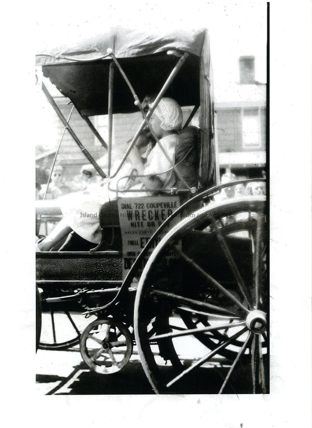 Black and white print showing Holsman car with girl and man inside. Girl wears all white, including a lacy white cap. Probably driving in the parade during a water festival. Side view. On the side of the car is a poster: "Dial 722 Coupeville Wrecker (Wrecked?) Nite or Day Sales Chevrolet...Shell...Ethyl....Open S..Days...." (obscured by wheel). Printed on Kodak paper.