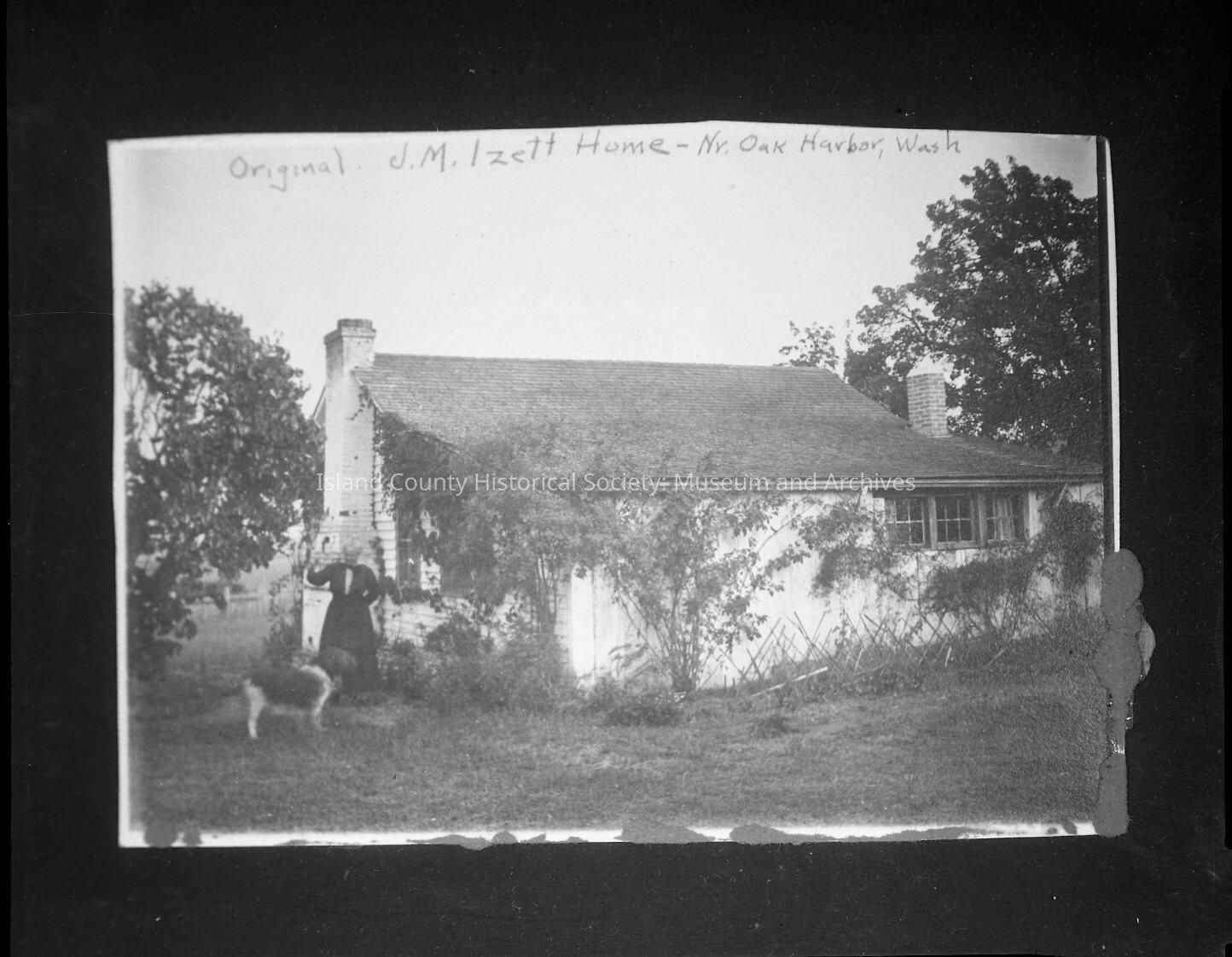 Photo shows side and front of a small house. Back of photo reads: Beach St, Jim Howes house, Lovejoy Boat Builders/lumber yard