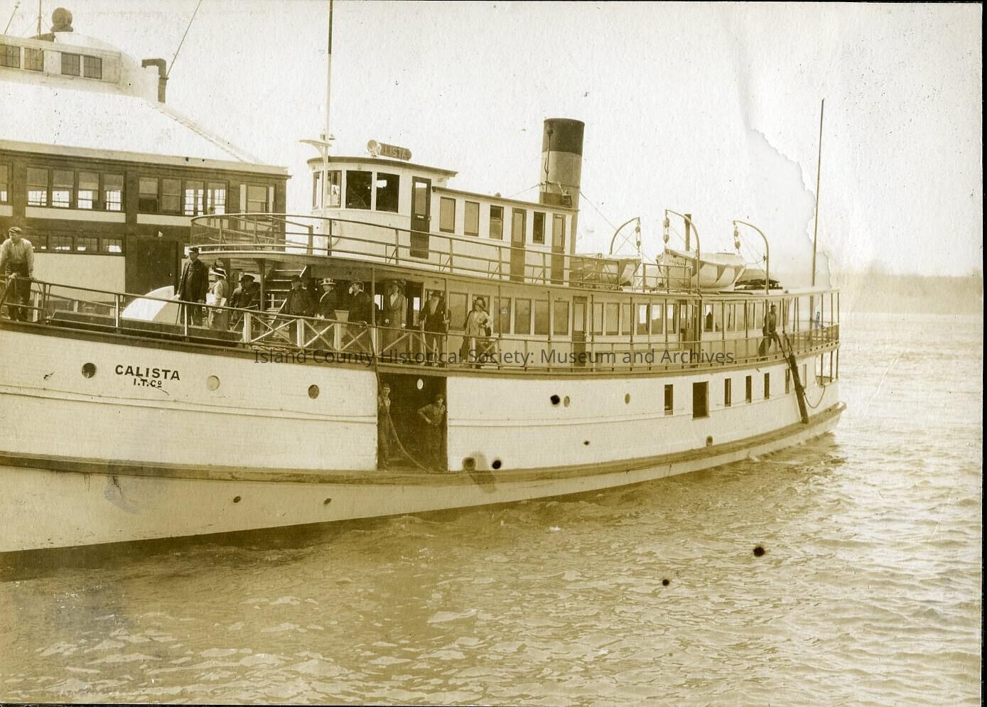 Side view of the boat "Calista" several people standing at the bow of the boat.