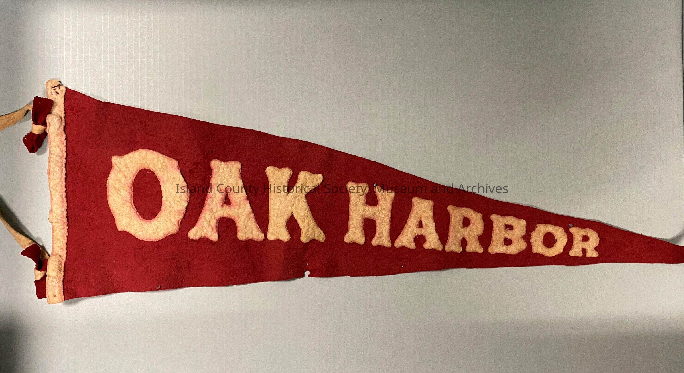 Oak harbor pennant made of felt, red with white letters. Has holes.