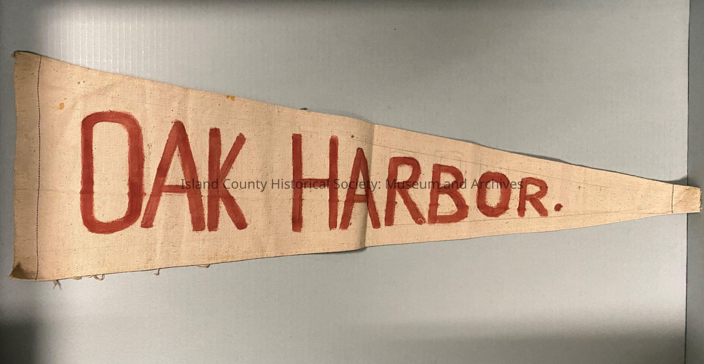 White canvas pennant with painted red lettering that reads Oak Harbor.