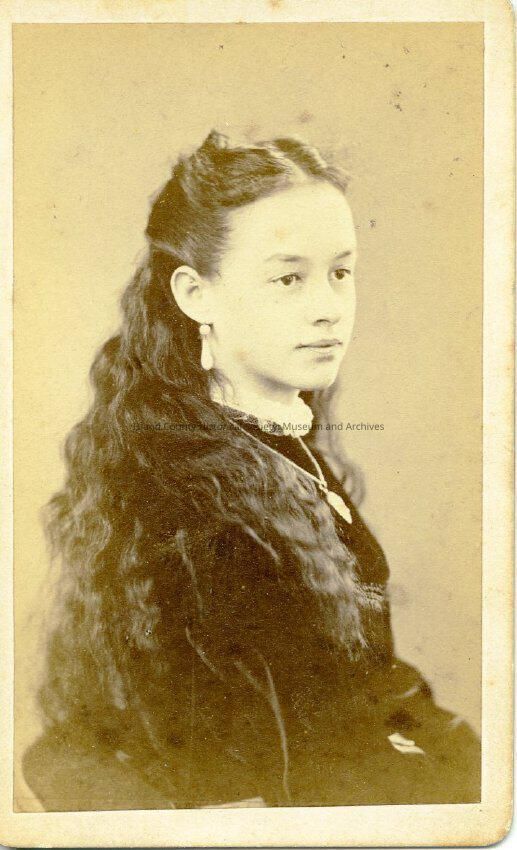 Profile view of a young woman with long hair, she is wearing a dress and earings. Woman is unidentified but of the Haller family.