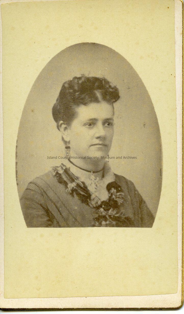 Portrait of a woman wearing a dress, scarf, necklace and earings. Her hair is styled up with curls on top. The woman is unidentified but of the Haller family. Possibly Nellie Moore Coupe, Haller's niece.