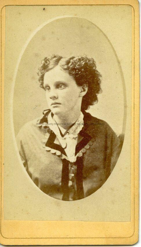 Portrait of a young woman wearing a dress. Curly Hair. Black ribbon collar with white lace. Looking off to right.