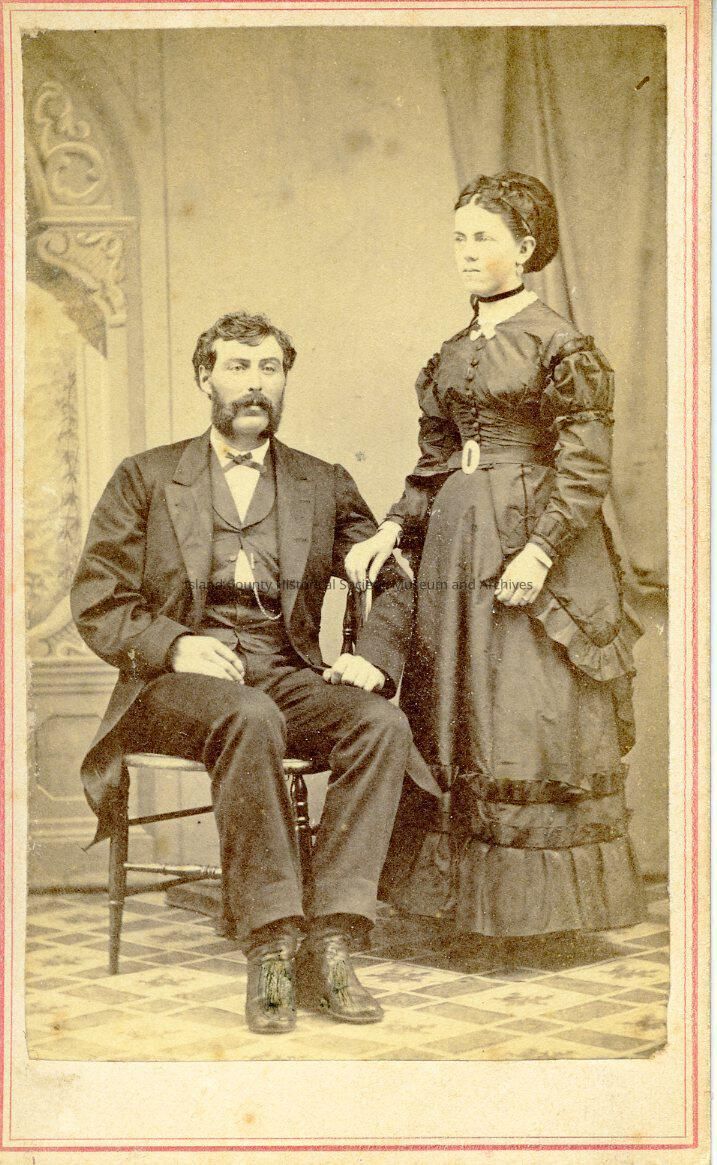 Portrait of an unidentified man and woman of the Haller family. He is seated wearing a dark suit and has a very distinctive mutton chops mustache. She is standing next to him wearing a dark full dress ruffles and her hair is styled up in a bun. Her right hand/arm is resting on his left arm. Black choker styled necklace.