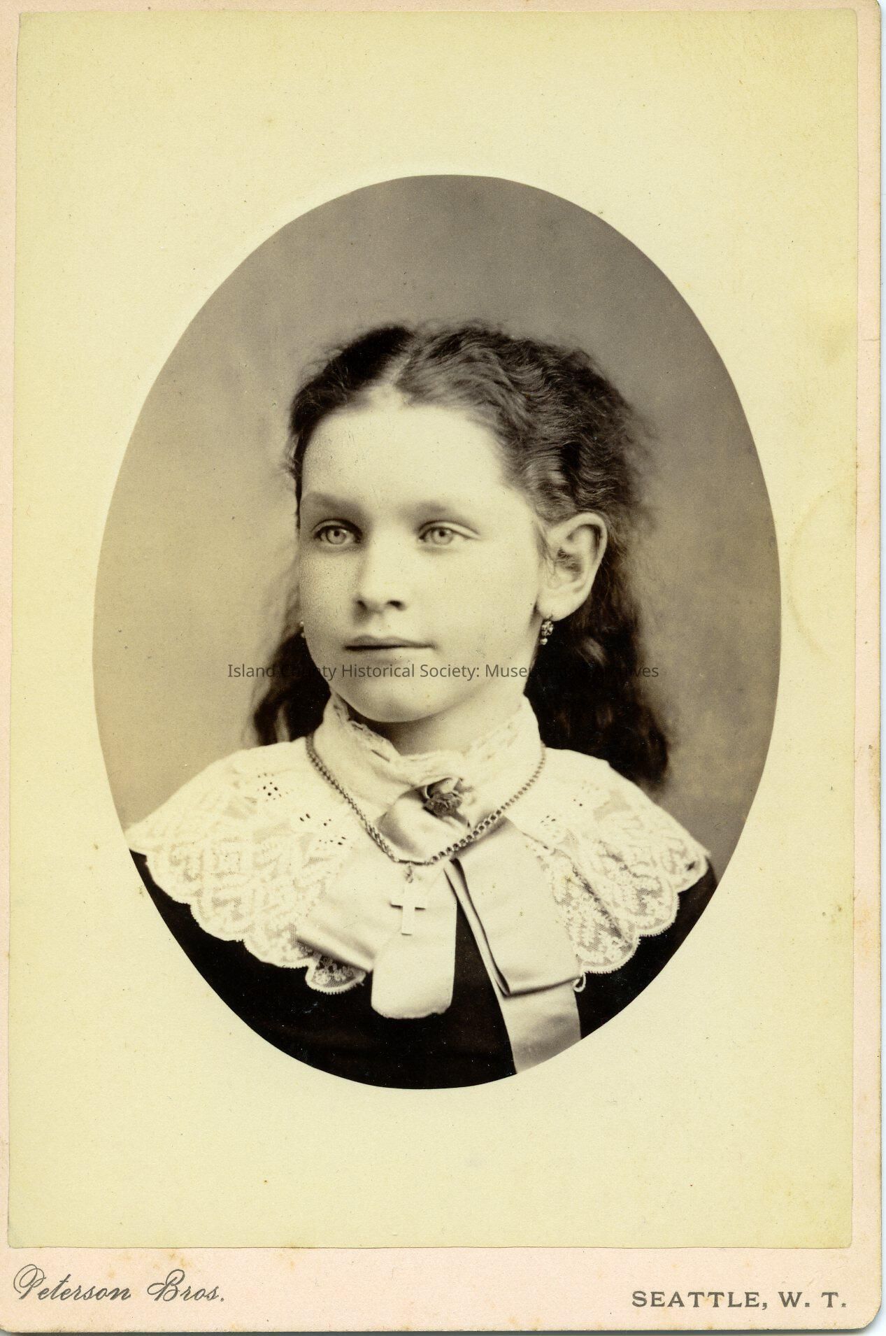 Portrait of an unidentified young girl possibly of the Haller family. She has long dark wavy hair. She is wearing a dress with a crocheted neck piece and bow, as well as a necklace with a cross. Possibly Louise Nichols, daugher of Mai Haller Nichols. (see pg 150 of Granville Haller: Leader. By Martin N. Chamberlain.
