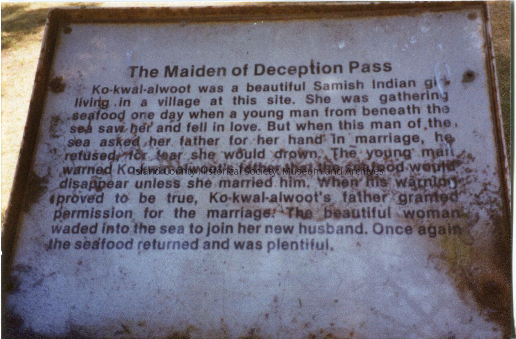 Plaque describing the story of "The Maiden of Deception Pass", Rosario Beach, Deception Pass State Park.