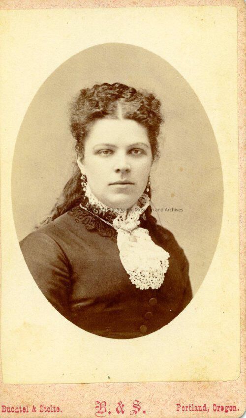 Portrait of an unidentified woman wearing a dark dress and crocheted neck scarf, her hair is pulled up and back. Possibly Lottie Haller (Charlotte), Daughter of Granville Haller. See pg. 46 in Granville Haller: Leader. By Martin N. Chamberlain.