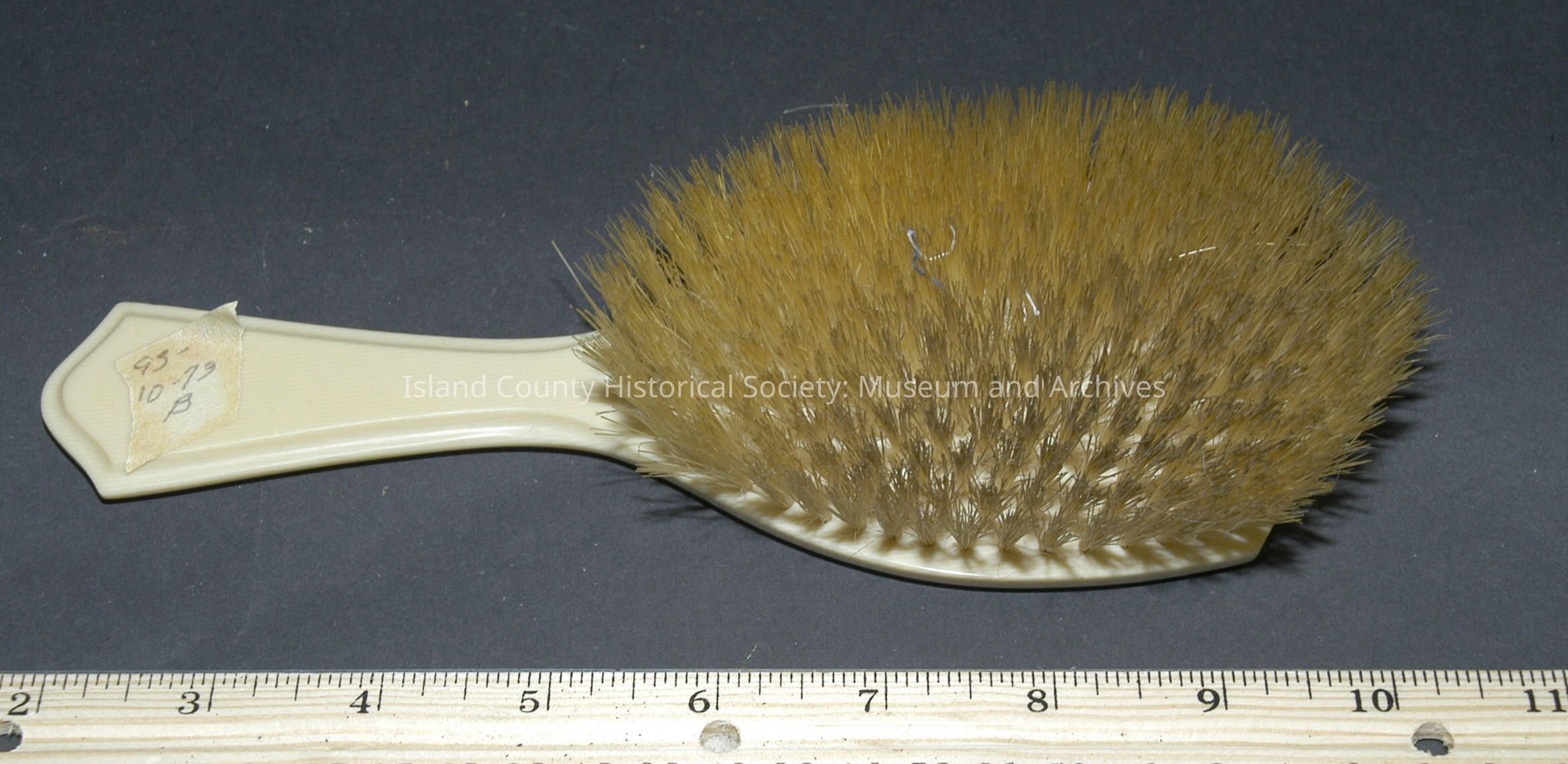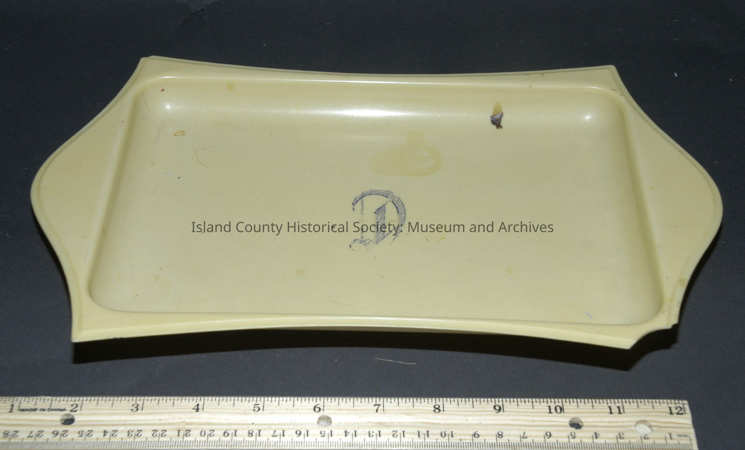 Dresser set (celluloid) with a monogram intial D on the tray, brush and nail buffer 93-10-73A - Tray 93-10-73B - Brush 93-10-73C - Comb 93-10-73D - Nail Buffer 93-10-73E - Cuticle article