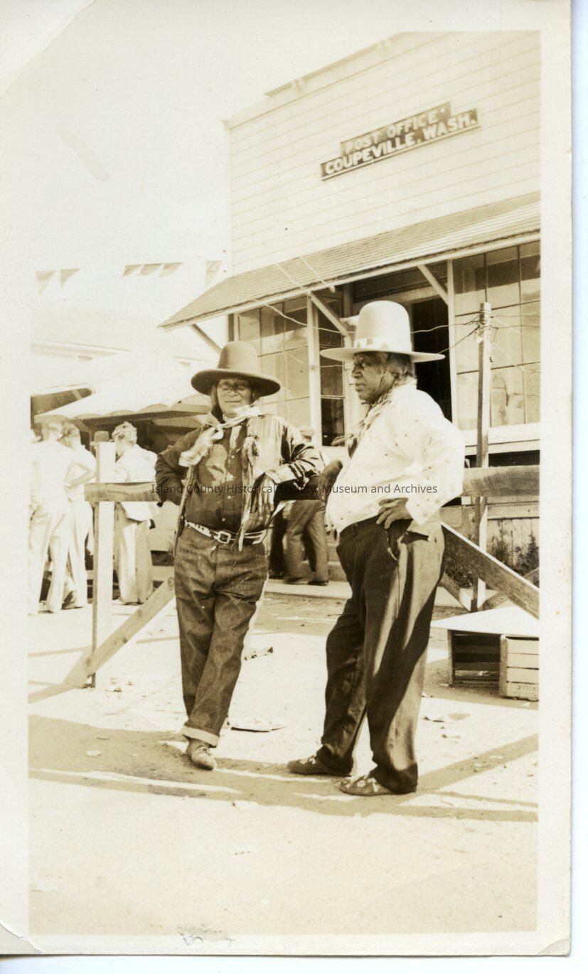 Sepia photograph of two Native American men dressed in cowboy-like attire. One faces to the side, whilst the other smiles at the camera. Both lean against a fence behind which is a building named Post Office Coupeville, Wash. Caucasian men behind them to the left of the photo, their backs turned away. On the back of the photo is written in blue ink: "Dwight- these are two old braves. We snapped these during our visit to the Indian Water Carnival at Coupeville." No date is given. Object ID written on back is 83-06-75, but this may be incorrect.Collection