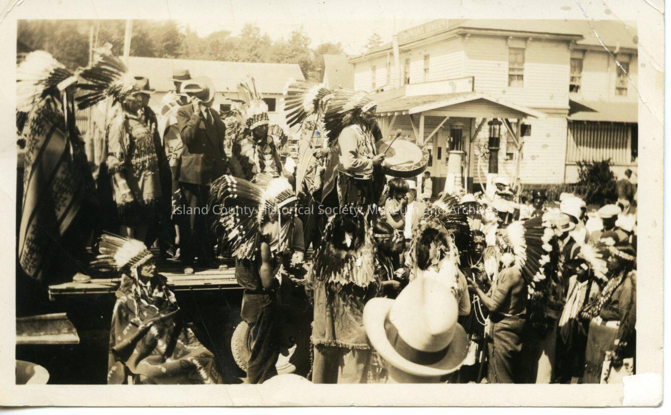 Black and white/sepia photograph of a Coupeville Water Festival (1930s probably). Appears to be part of the parade. A group of primarily Native American men stand up on the back of a crude sort of "float" (wooden slats driven on tires) and other Native Americans mill around alongside it. Near wharf, outside the Starwana Tavern (where Museum is now). On back is written "Indian Water Festival", "Finish", "Sparkle" and "Barbara Ward".Collection