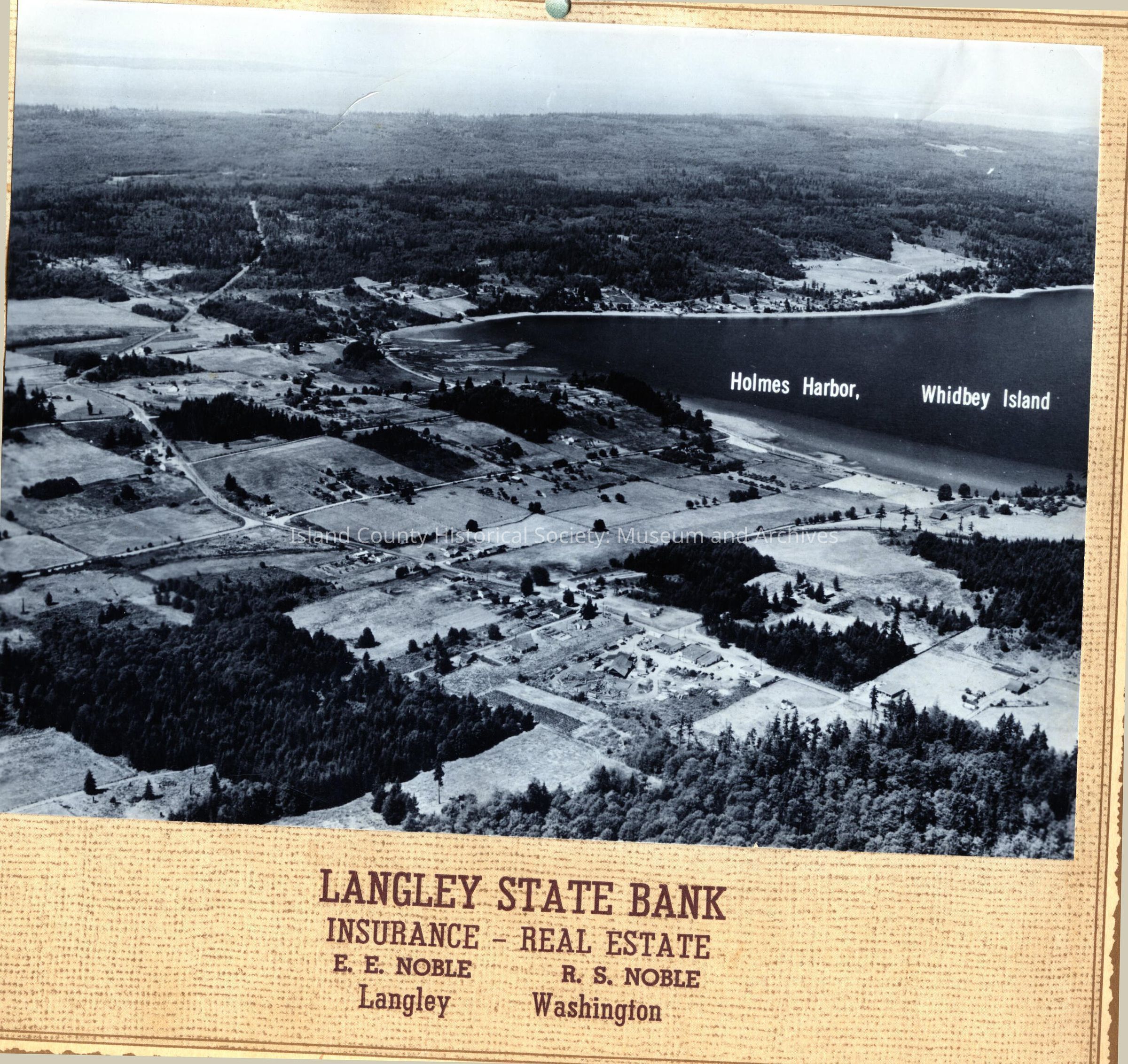 Black and White aerial photo of Holmes Harbor. The image is attached to a tan piece of cardstock that has Langley State Bank Insurance - Real Estate calendar. The image does not have a date and on the backside of the image is the "Homemaker's Tables."