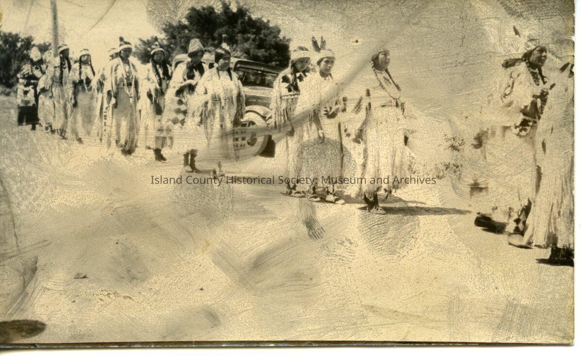 Black and white photograph of Native American women walking along a street dressed in traditional garb. Photo is smeared with fingerprints.