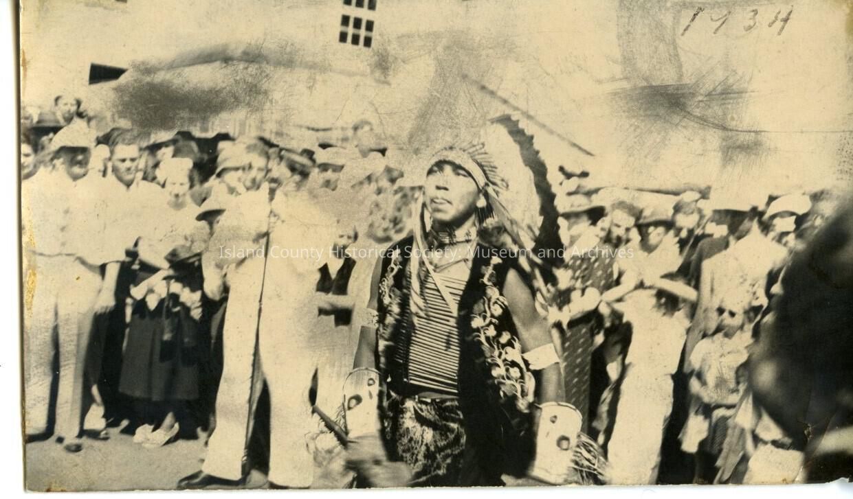 Black and white photograph of Native American young male dancing before an audience at a water festival (written in upper right corner it says 1934). He wears a feathered headdress, necklace, armbands and other traditional garb. His tongue sticks out in concentration/effort.Collection
