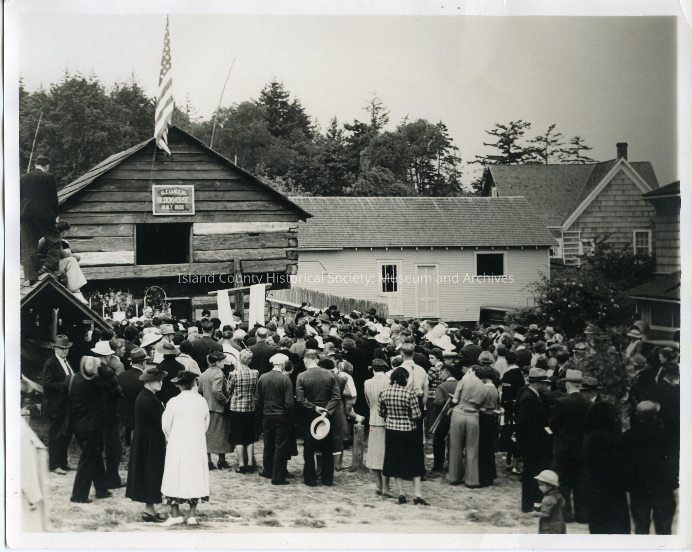 Black and white photograph of the Dedication of the Cross ceremony at one of the water fesitvals. The cross is raised up outside the Alexander Blockhouse. The cross is cloaked in two white panels. On the left of the photo one can glimpse Father O'Brien standing alongside what might be an altar. People are gathered around, mostly standing, whilst two men perch on the roof of an open-sided shed on the left. 1940s-50s.Collection