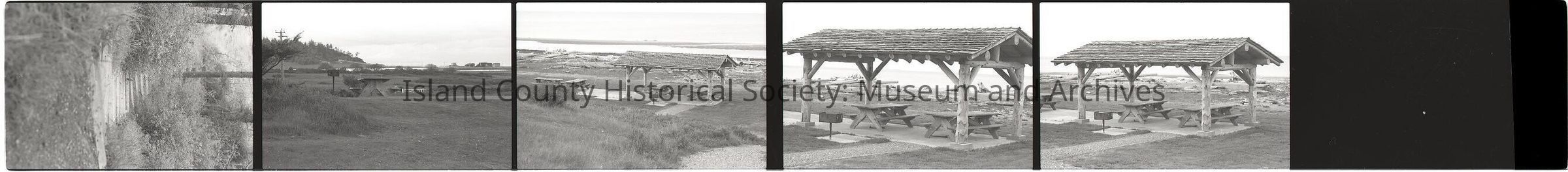 Negative strip of 6 frames 35-39 showing pavilions on beach of Joseph Whidbey State Park.