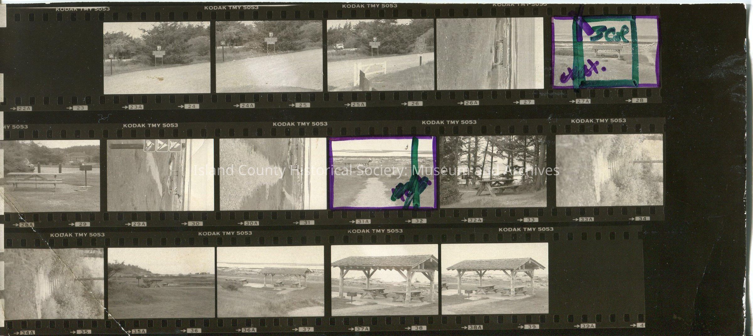 Photo of three negative strips of Joseph Whidbey State Park a,b, and c. Showing park entrance, park beach, and park pavilions.