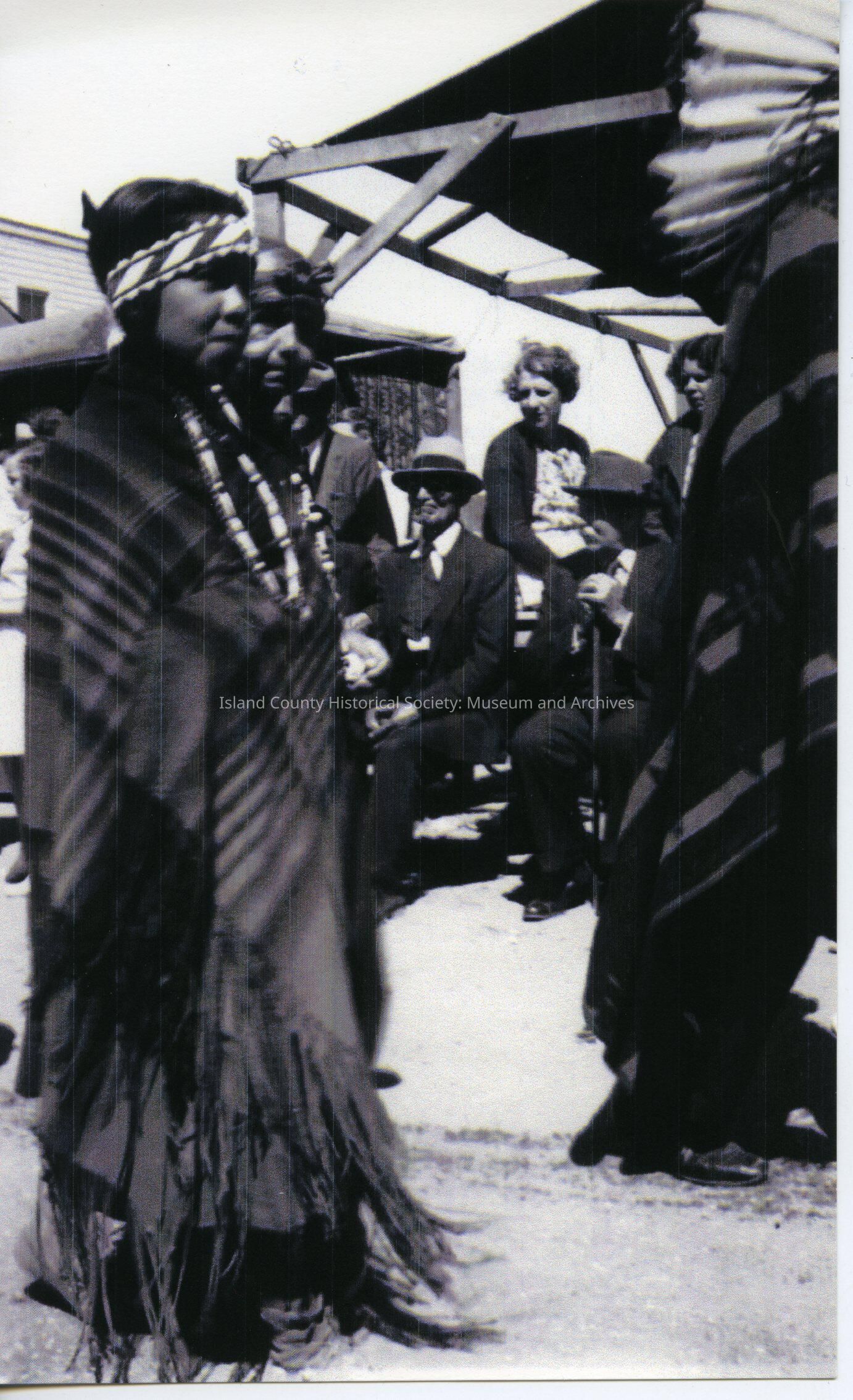 Black and white photograph a Native American girl in ceremonial garb, including headband, necklace and wrapped in a long thick shawl/blanket. An old Native American woman stands behind her. In the background are men and women sitting looking at them or something else going on in front of them. 1940s water festival.Collection
