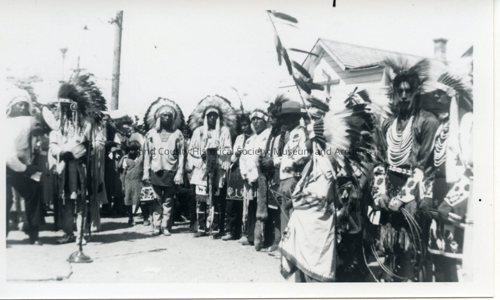 Black and white photograph of Native Americans (mostly men) standing in a semi-circle dressed in ceremonial clothing. One man holds a thin pole with feathers attached and another man on the right holds a set of hoops. A Caucasian male on the left bends over, wearing a sailor cap.Collection