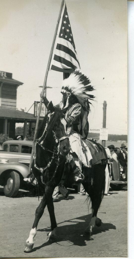 Black and white photograph of a Native American "princess" leading a parade at the 1940 water festival. She is young and in full ceremonial dress sitting upon a horse. She is looking down whilst holding up a US flag. 1940s cars and a few spectators in the background, as well as what is probably the Starwana Hotel. Hand written on the back: "Coupeville Indian Festival August 1940".Collection