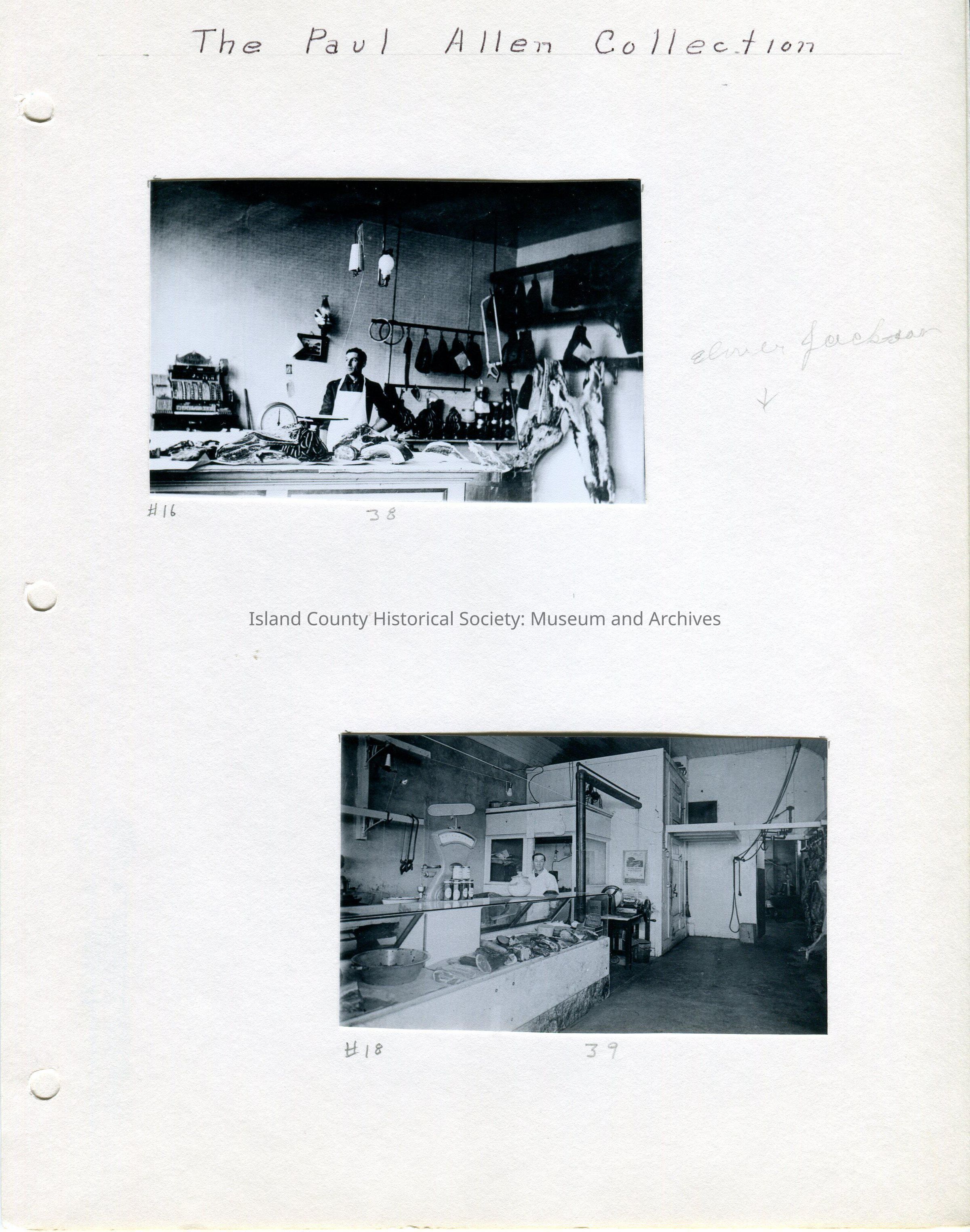 Bottom Photo - 4.25"W x 2.5"H - photo of the inside of a butcher shop with a man in an apron behind the service counter. The photo was taken looking from the front of the store toward the back with the meat counter on the left. The name Elmer Jackson is written next to the pictures.Lexicon