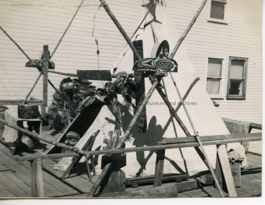 Black and white photograph of a Native American tepee at the 1940 water festival. It is cordoned off by poles. Carved wooden symbols that resemble eagles are attached to the crisscrossing poles at either side of the tepee. The tepee is open, and a carved head can be seen in the entryway. It stands next to a white/light-coloured building seen in the background. Hand written on the back: "Coupeville Indian Festival August 1940".Collection