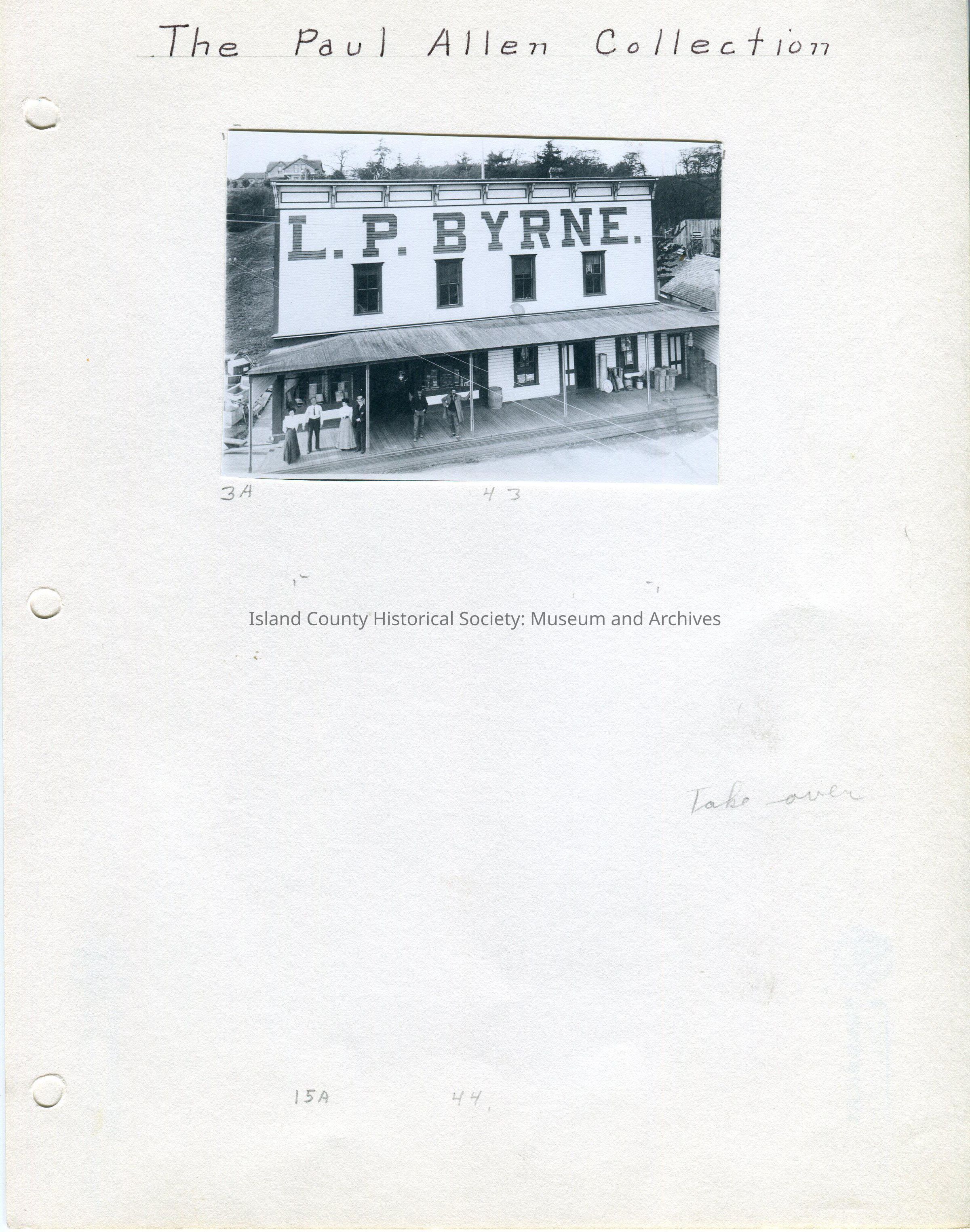 Top Photo - 4.25"W x 3"H - photo of the L. P. Byrne store. The white building has four second story single windows and a roofed porch along its length. "L. P. Byrne." is written across the top of the building in very large letters. There are men & women standing on the porch.Lexicon