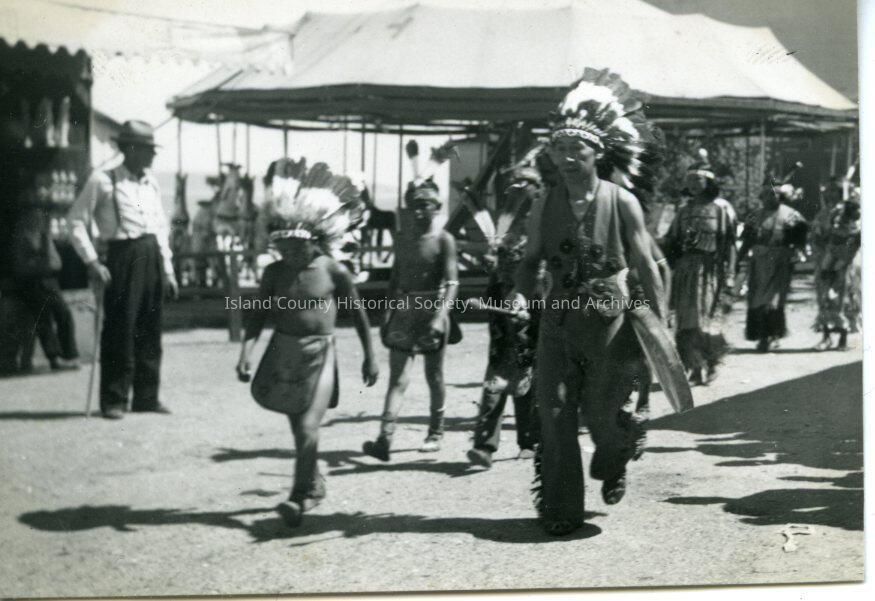 Black and white photograph of Native Americans walking in the 1940 water festival parade. They are in ceremonial garb, wearing headdresses, loincloths and waistcoats. Most are boys and women, but an adult man is in front, carrying a drum. A carousel is in the background. Hand written on the back: "Coupeville Indian Festival August 1940".Collection
