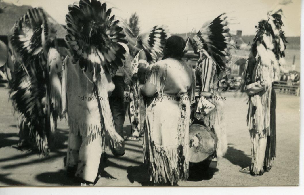 Black and white photograph of Native Americans (mostly men and one woman), all in a huddle, their backs turned to the camera. They are in ceremonial dress. One man holds a drum, and his arm cuff has a deer decoration. Hand-written on the back: "Coupeville Indian Festival August 1940".Collection