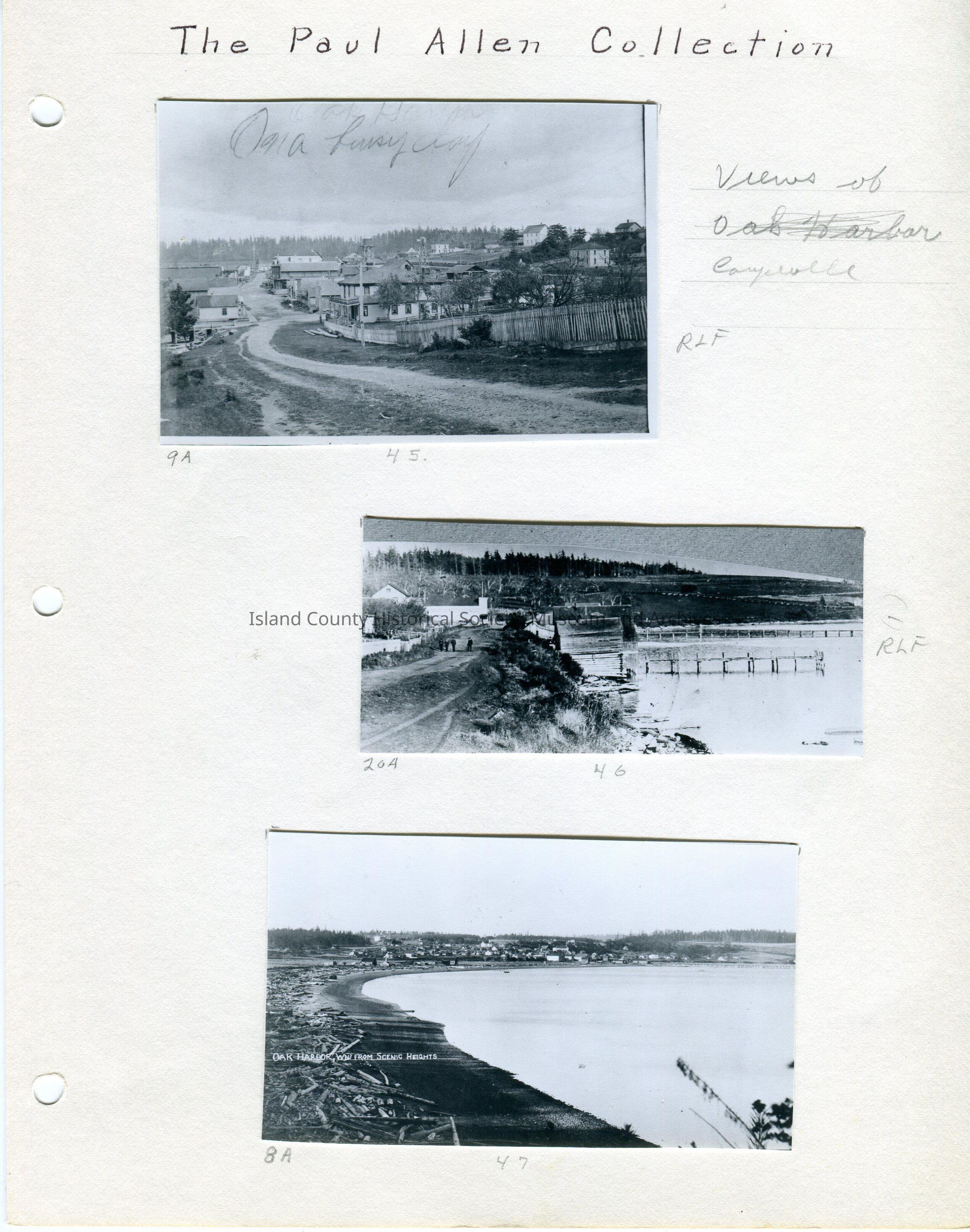 Bottom Photo - 4.5"W x 2.5"H - view of Oak Harbor from Scenic Heights. The photo was taken looking down on the waterfront and harbor with houses and buildings in the distance. The shoreline is covered with driftwood above the low tide mark.