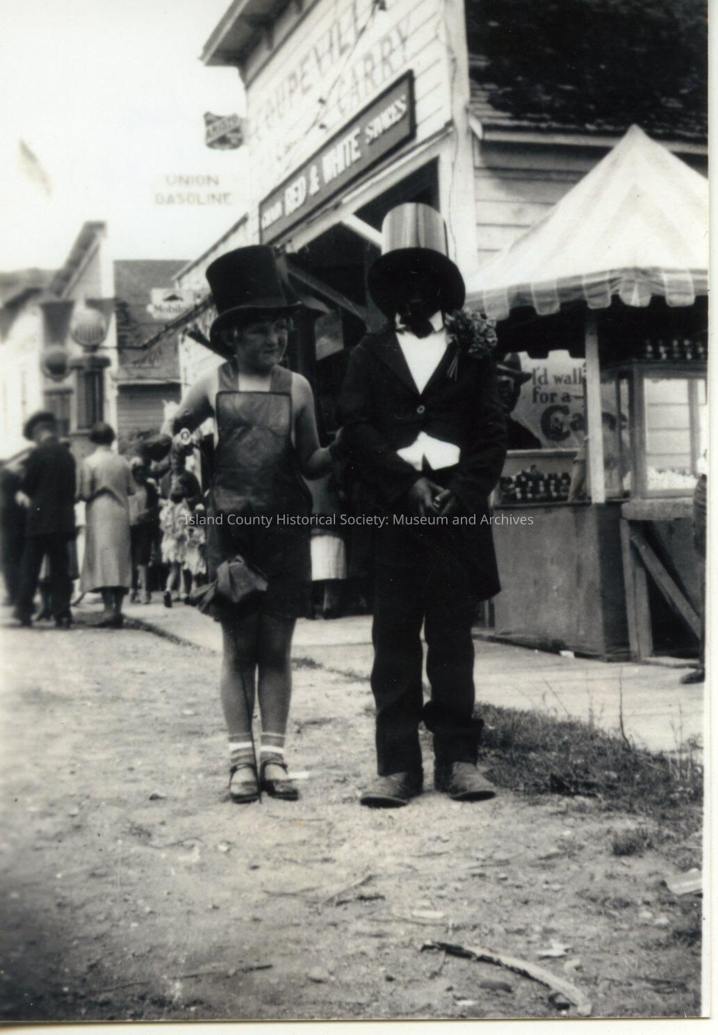 Black and white photograph of two children, a boy and a girl, in fancy dress for the water festival. The girl wears overalls and a top hat, standing on the left of the photo, holding the arm of her fellow friend. The girl is identified as Cecilia Starks (Holt). The boy is in black face, wearing a top hat and dark suit. The boy is identified as Chuck Ruthford (brother of Carol Ruthford Thrailkill?). They stand together on the street with the Coupeville Cash and Carry behind them. People walk along the street in the background. To their right is a market stall.Collection