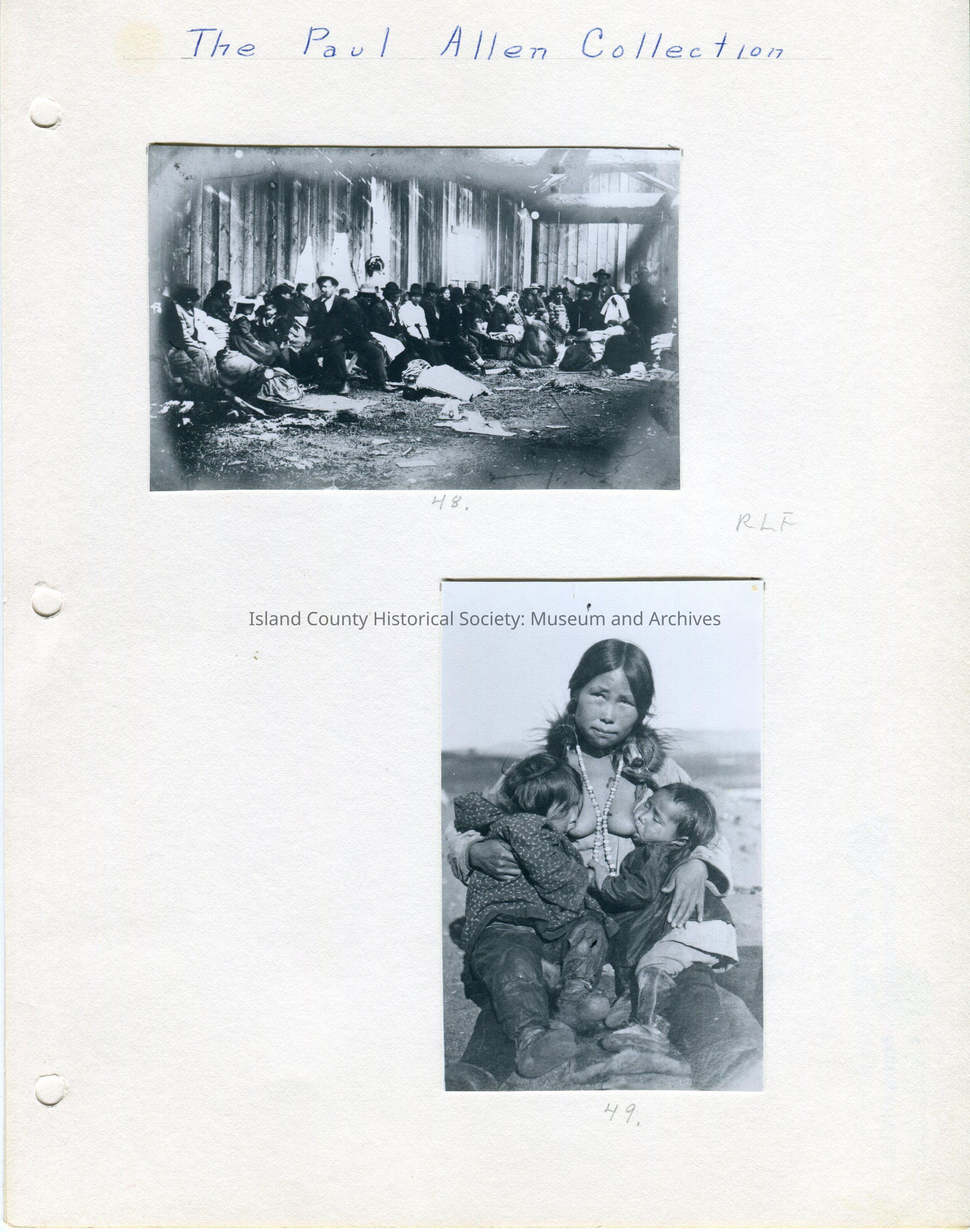 Top Photo - 4.5"W x 3"H - photo of the inside of a potlatch house filled with Native American men, women, and children sitting around the perimeter. A yellow sticky note said, "potlatch house Monroe Landing".