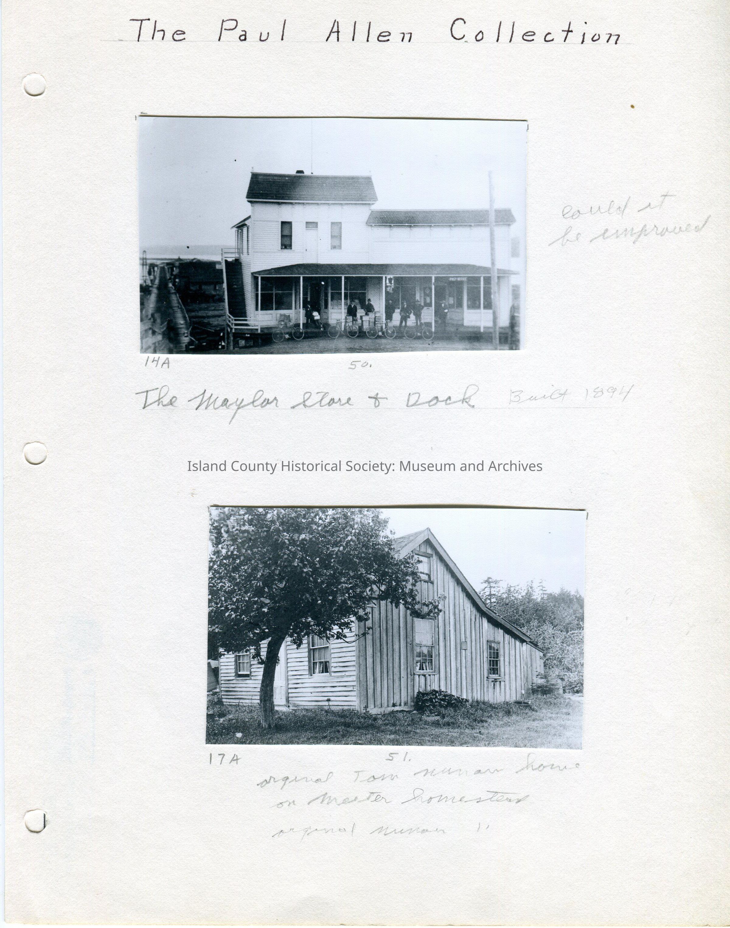 Top Photo - 4.5"W x 2.75"H - photo of the Maylor store and dock. The building is a large two-story wood structure painted white. The second story has a door with a single window on each side. There is a covered porch across the front of the building. Bicycles are leaning the porch posts in front of the store, and a group of men are standing on the porch.