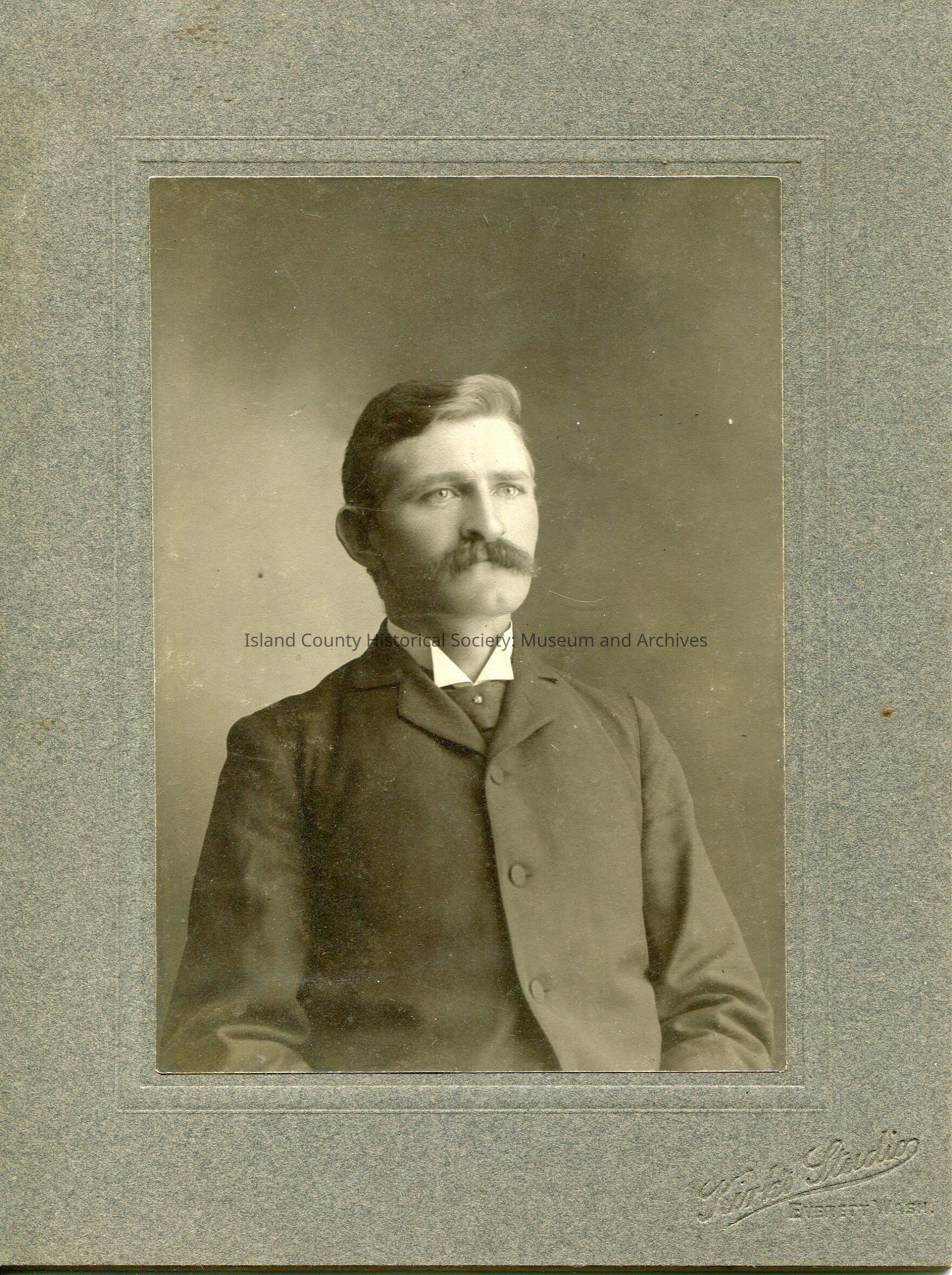 Black & white portrait photo of John Maylor. He is an adult man with light hair and a bushy mustache. He is wearing a dark suitjacket with three buttons, a white high collared shirt, and a tie.