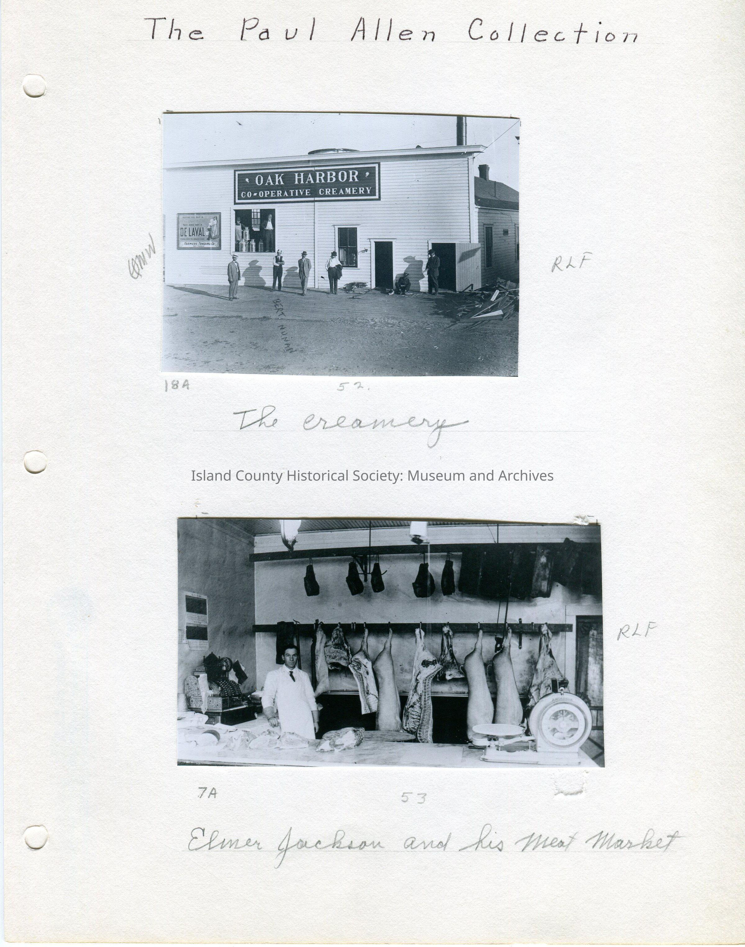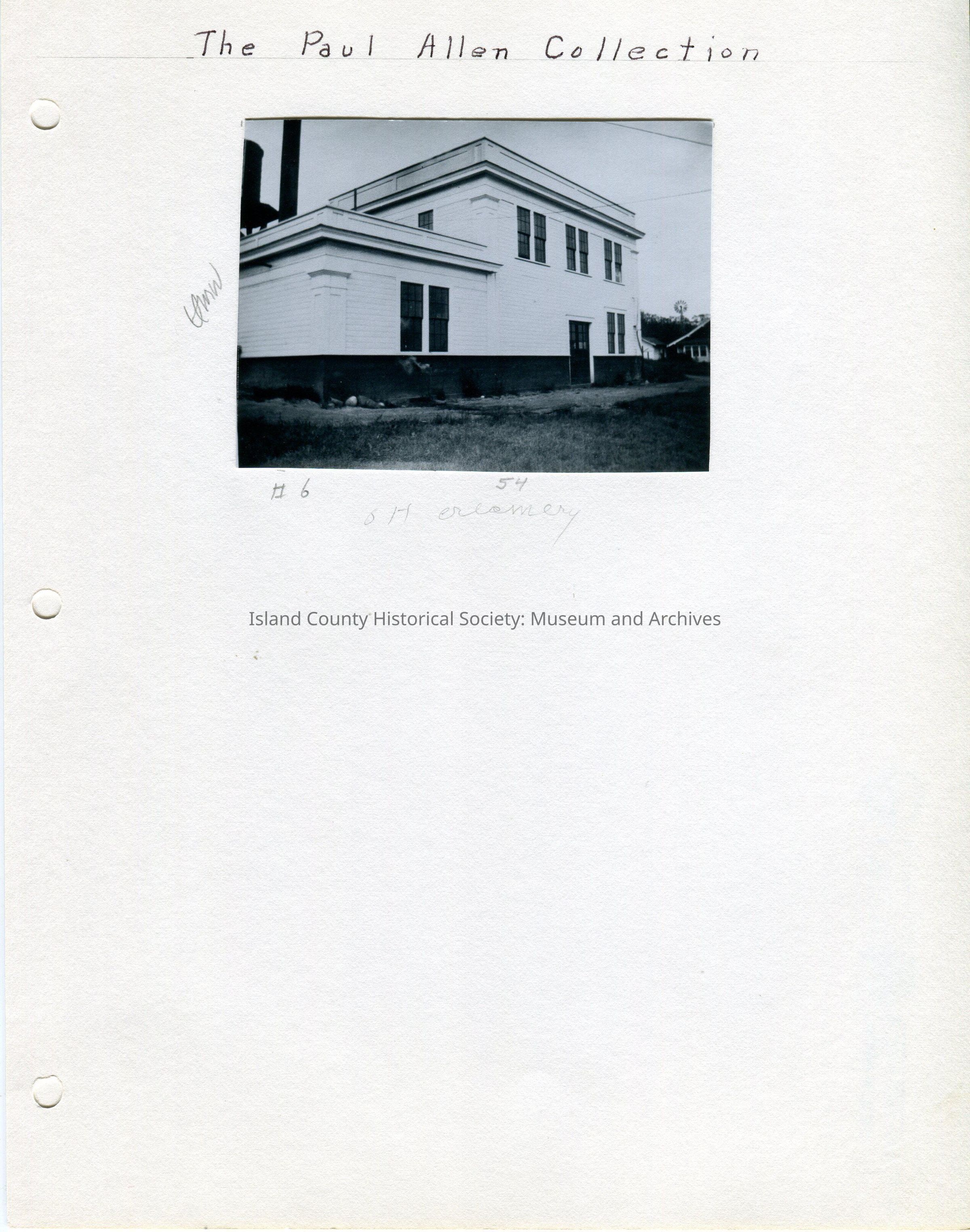 Top Photo - 4"W x 3"H - photo of the Oak Harbor Co-Operative Creamery. The building is a one-story white wood building with two windows and two doors. Five men are standing in front of the building.