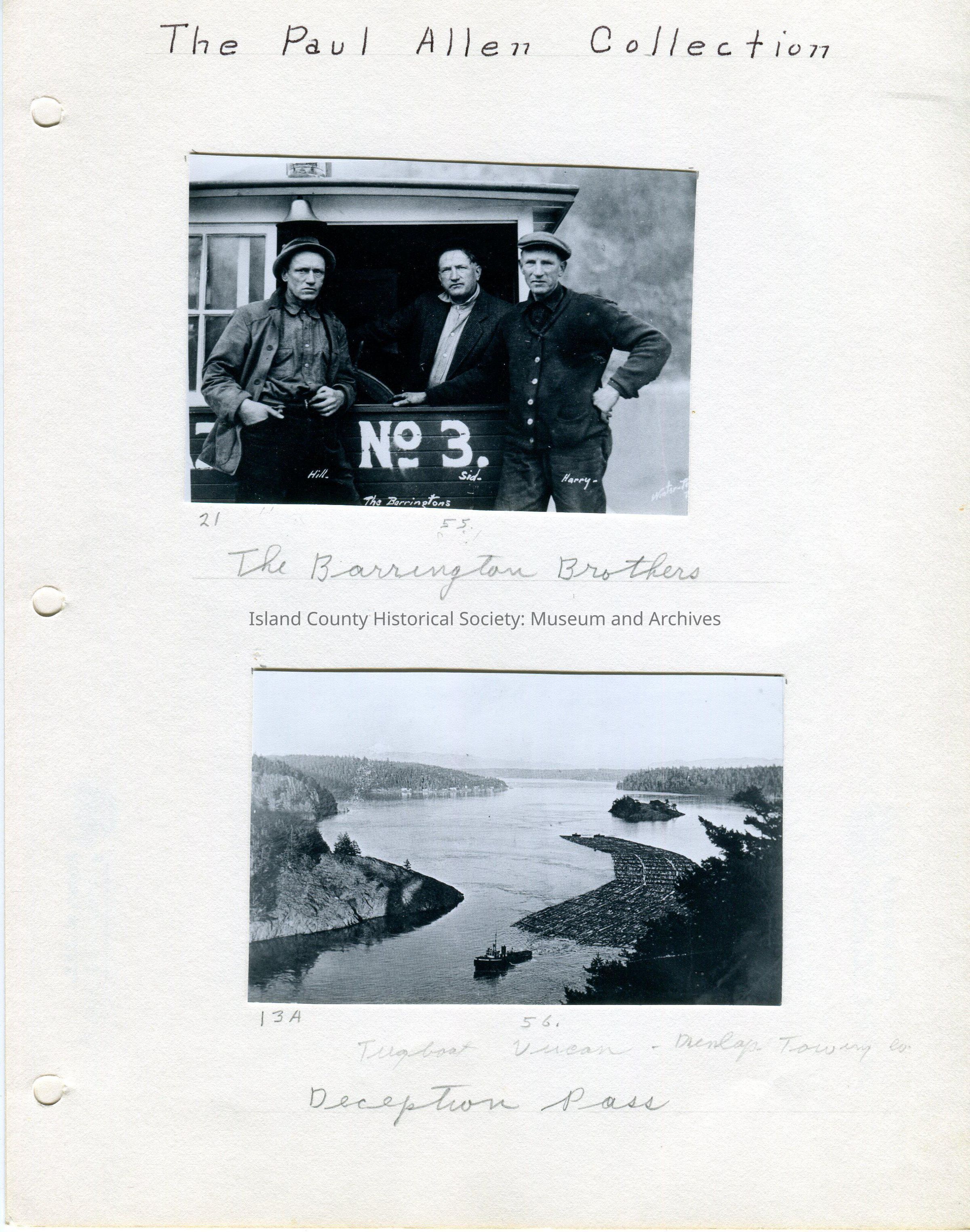 Top Photo - 4.5"W x 3"H - photo of Hill, Syd, and Harry Barrington, sons of Captain Ed Barrington. The three brothers are standing in the bow of a boat with a No. 3 painted on a sign in front of the wheelhouse. There was a yellow sticky note next to the picture, " L-R - Capts. Hill, Syd, Harry sons of Capt. Ed Barrington.