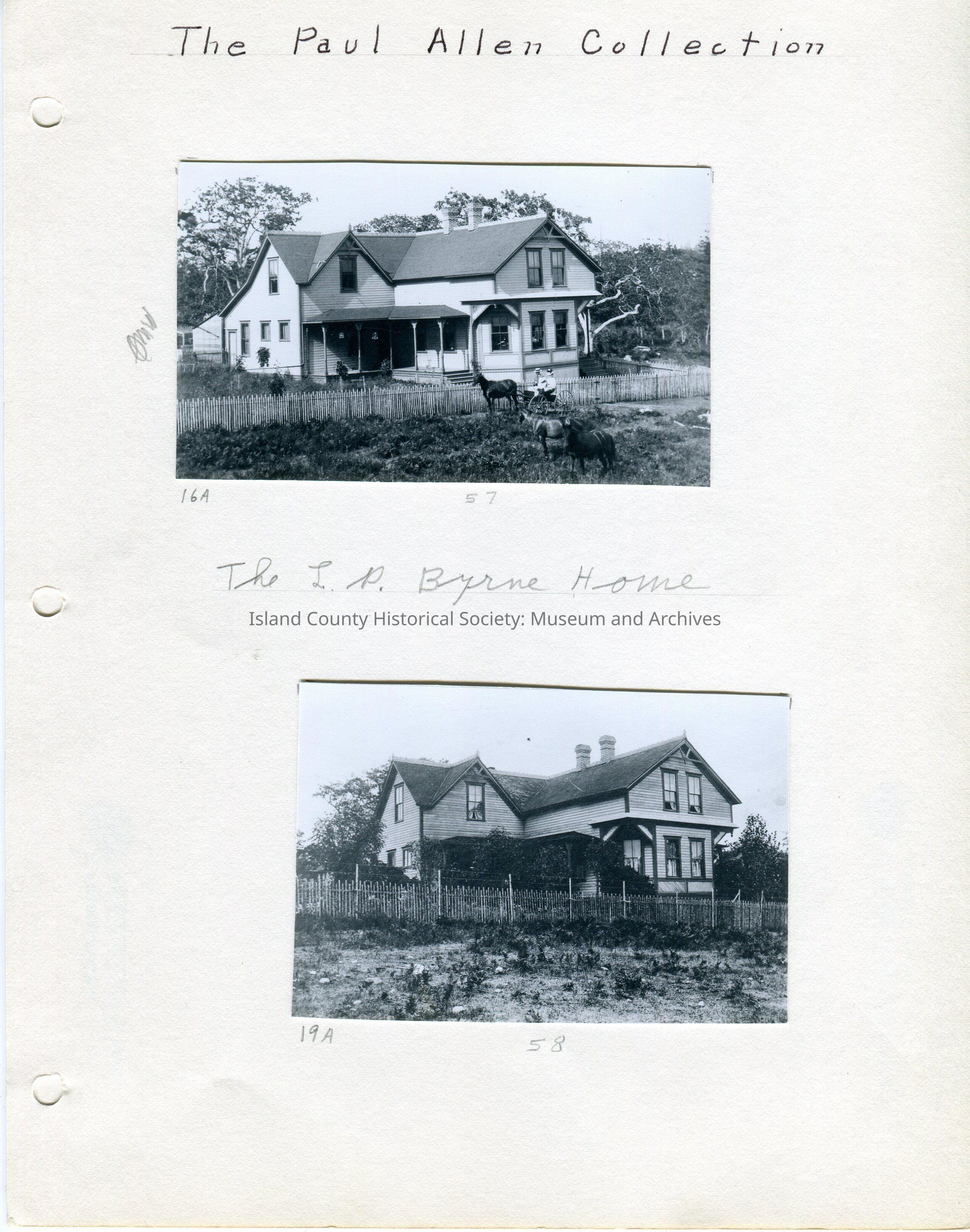 Bottom Photo - 4.25"W x 3"H - photo of the L. P. Byrne home. It is a two-story, large house witha covered porch and picket fence across the front. It appears to be a later picture than the one above. The house shows a deteriorating roof, worn siding in need of paint, and overgrown vegetation around the porch.Lexicon