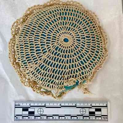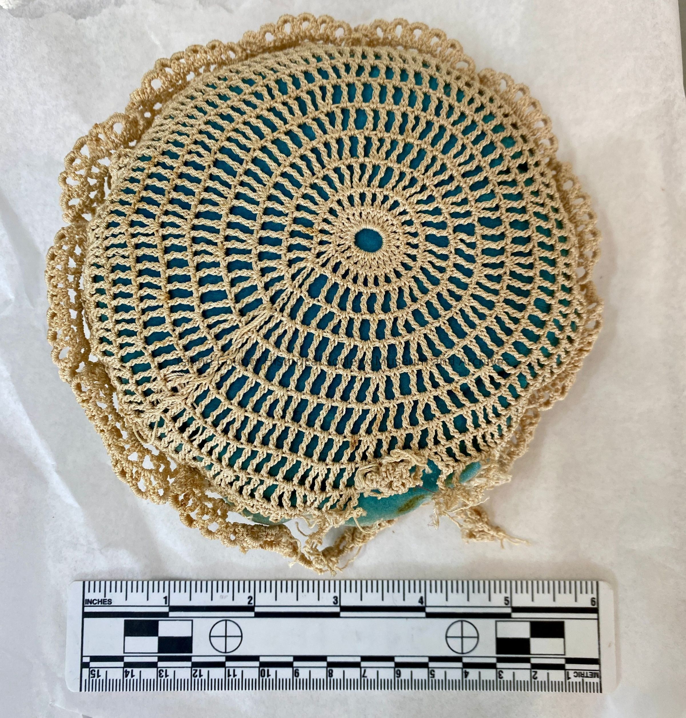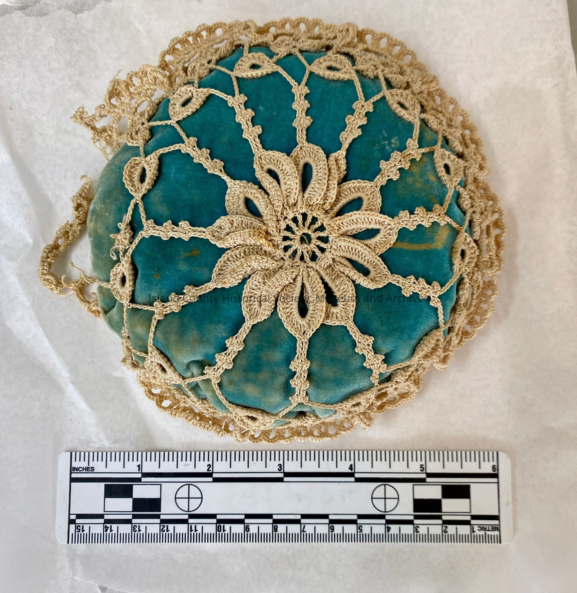 A blue velvet and creme crochet pin cushion, handmade. Likely c. mid-late 1800s.